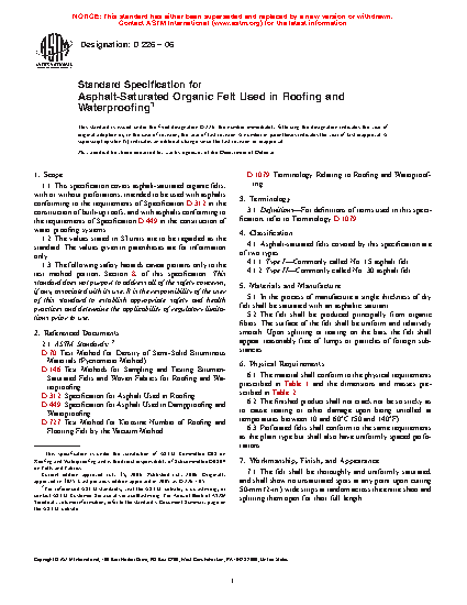 1.1 This specification covers asphalt-saturated organic felts, with or without perforations, intended to be used with asphalts conforming to the requirements of Specification D 312 in the construction of built-up roofs, and with asphalts conforming to the requirements of Specification D 449 in the construction of water proofing systems.