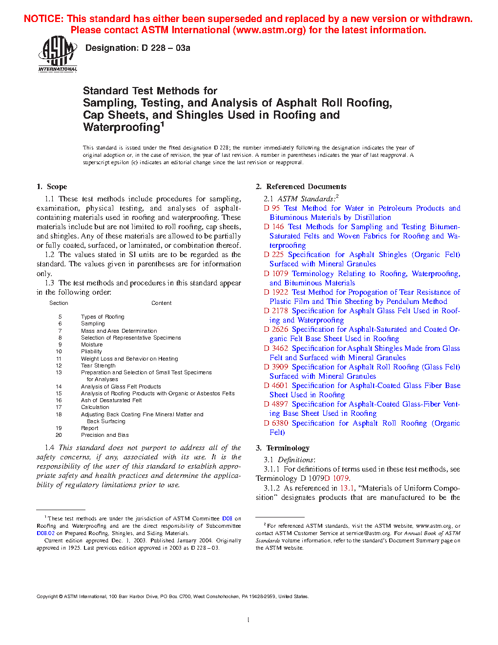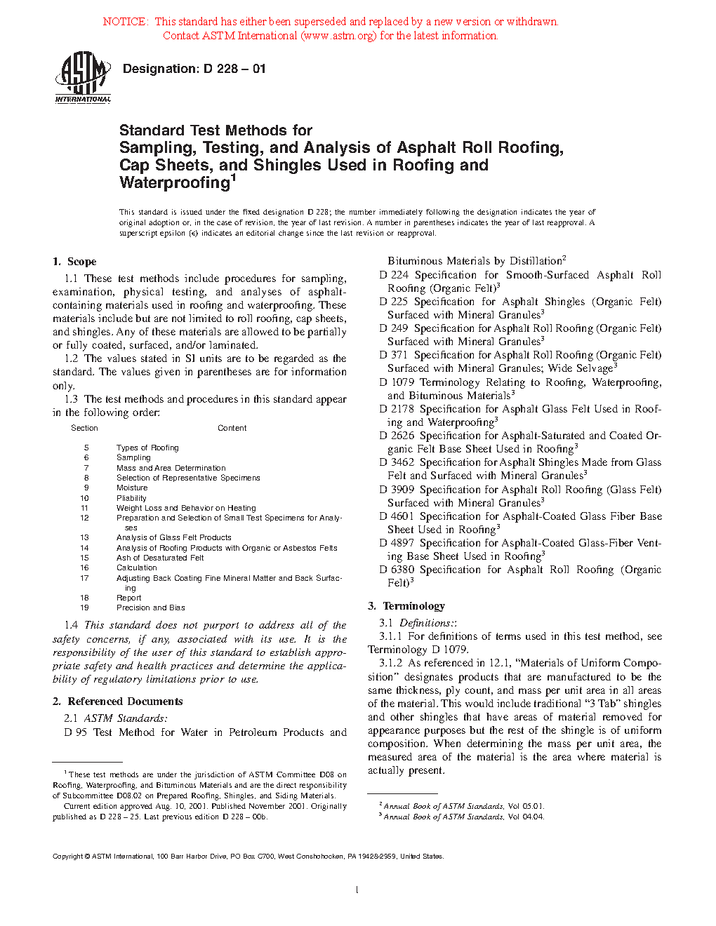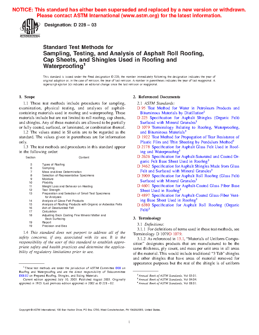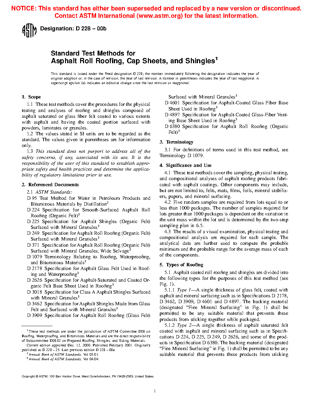 These test methods include procedures for sampling, examination, physical testing, and analyses of asphalt roll roofing, cap sheets, and shingles used in roofing and waterproofing. Other components of these materials are allowed to include, but are not limited to, felts, mats, films, foils, mineral stabilizers, papers, and mineral surfacing.