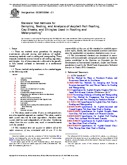 1.1 These test methods cover procedures for sampling, examination, physical testing, and analyses of asphalt-containing materials used in roofing and waterproofing. These materials include but are not limited to roll roofing, cap sheets, and shingles. Any of these materials are allowed to be partially or fully coated, surfaced, or laminated, or a combination thereof.