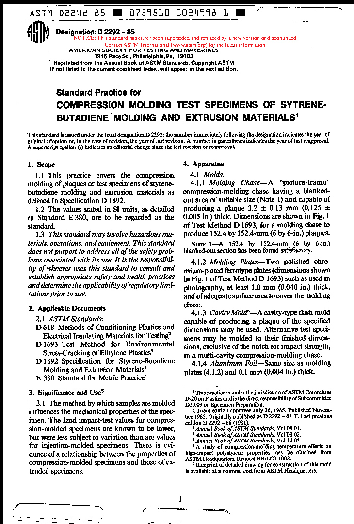 Recommended Practice for Compression Molding Test Specimens of Styrene-Butadiene Molding and Extrusion Materials (Withdrawn 1992)