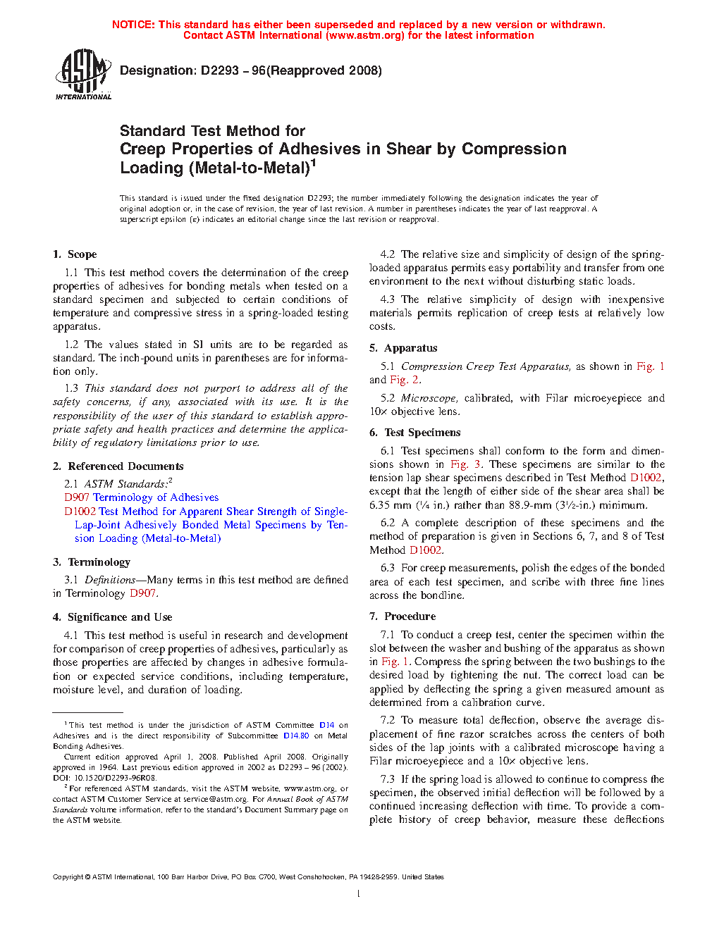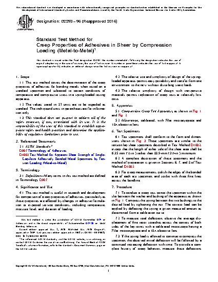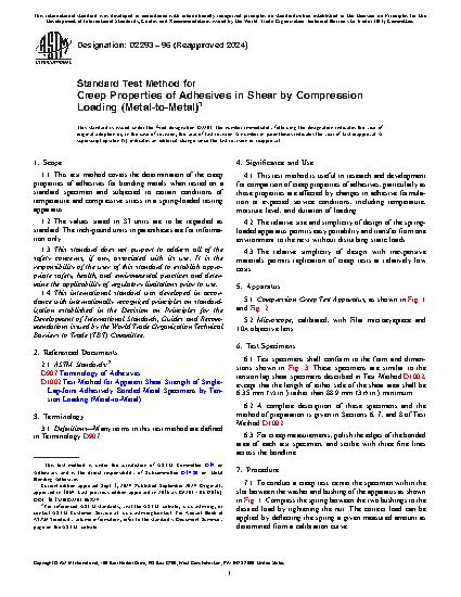 1.1 This test method covers the determination of the creep properties of adhesives for bonding metals when tested on a standard specimen and subjected to certain conditions of temperature and compressive stress in a spring-loaded testing apparatus.