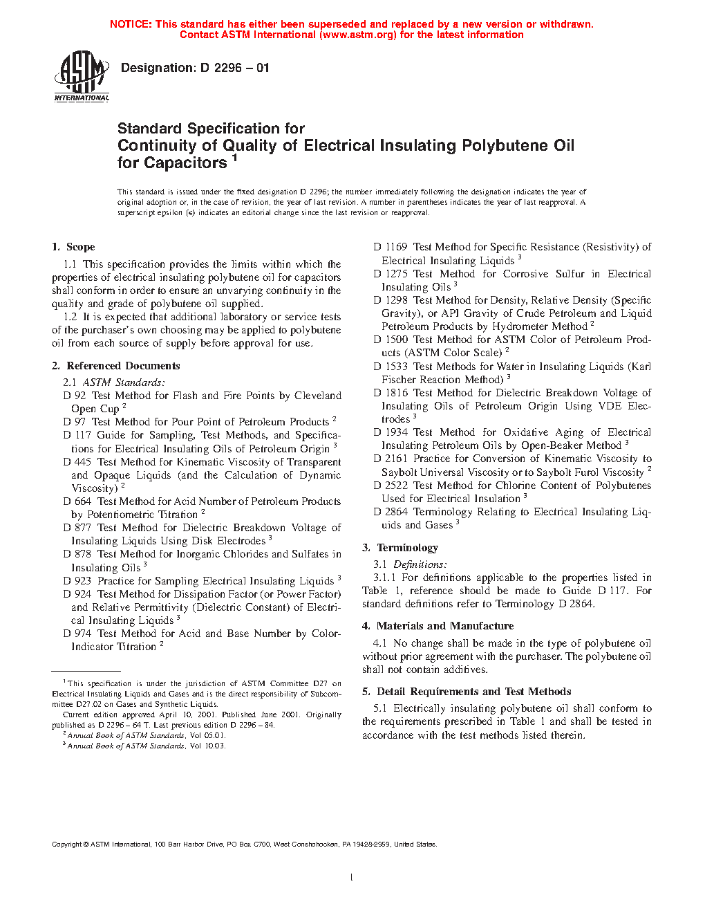 Standard Specification for Continuity of Quality of Electrical Insulating Polybutene Oil for Capacitors