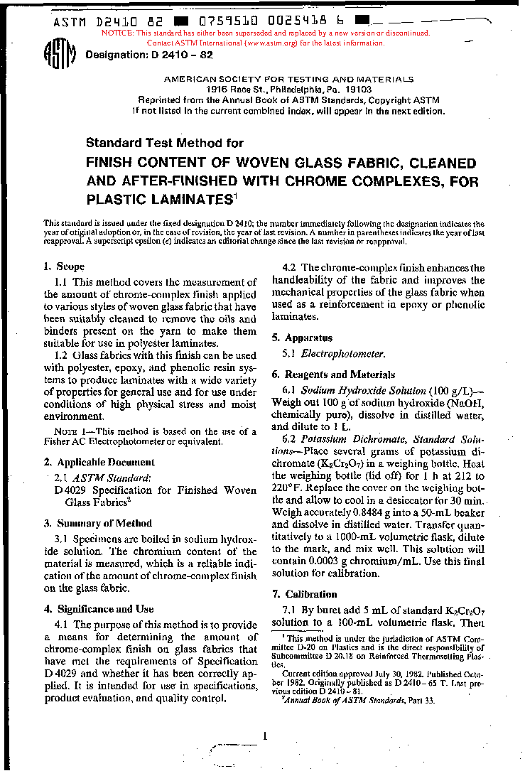 Test Method for Finish Content of Woven Glass Fabric, Cleaned and After-Finished with Chrome Complexes, for Plastic Laminates (Withdrawn 1988)