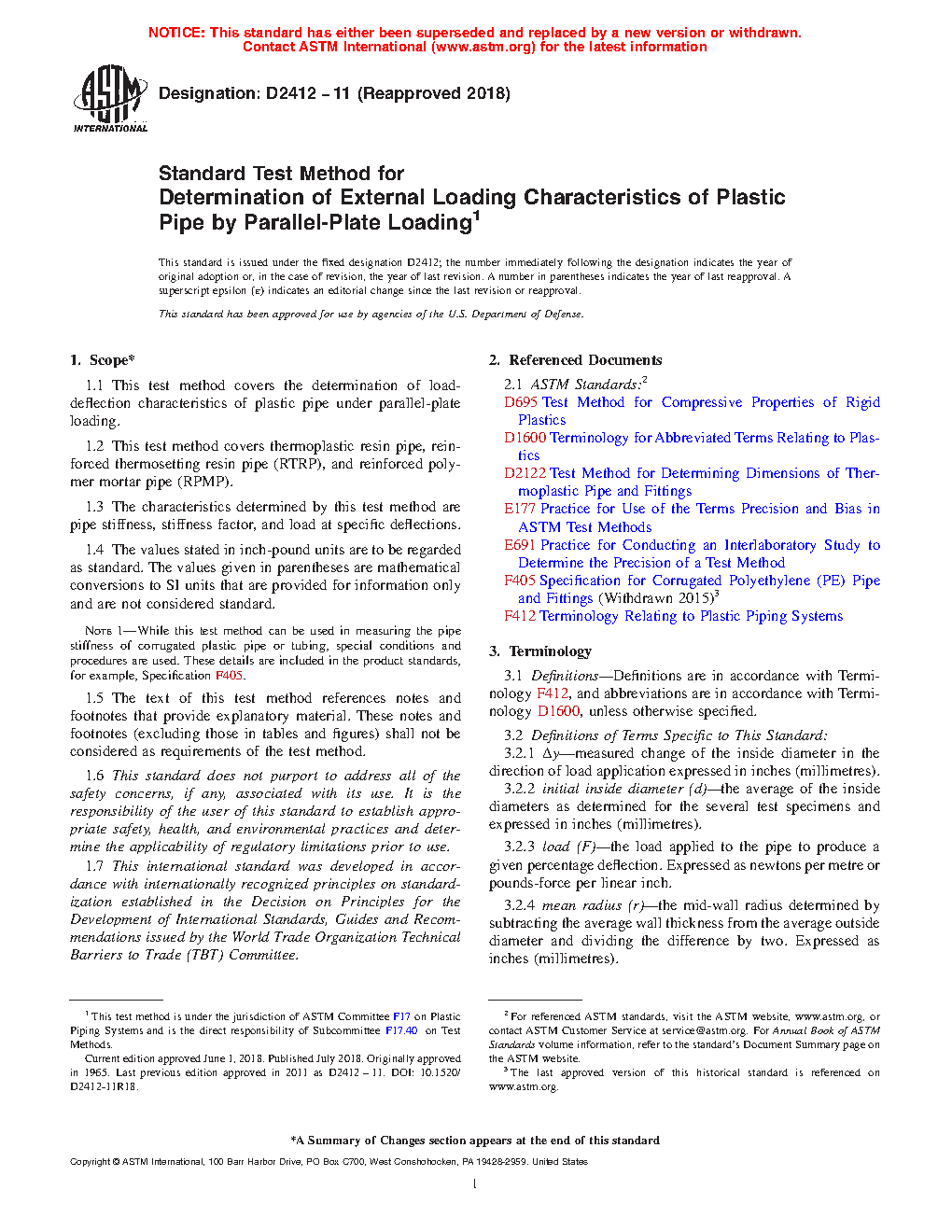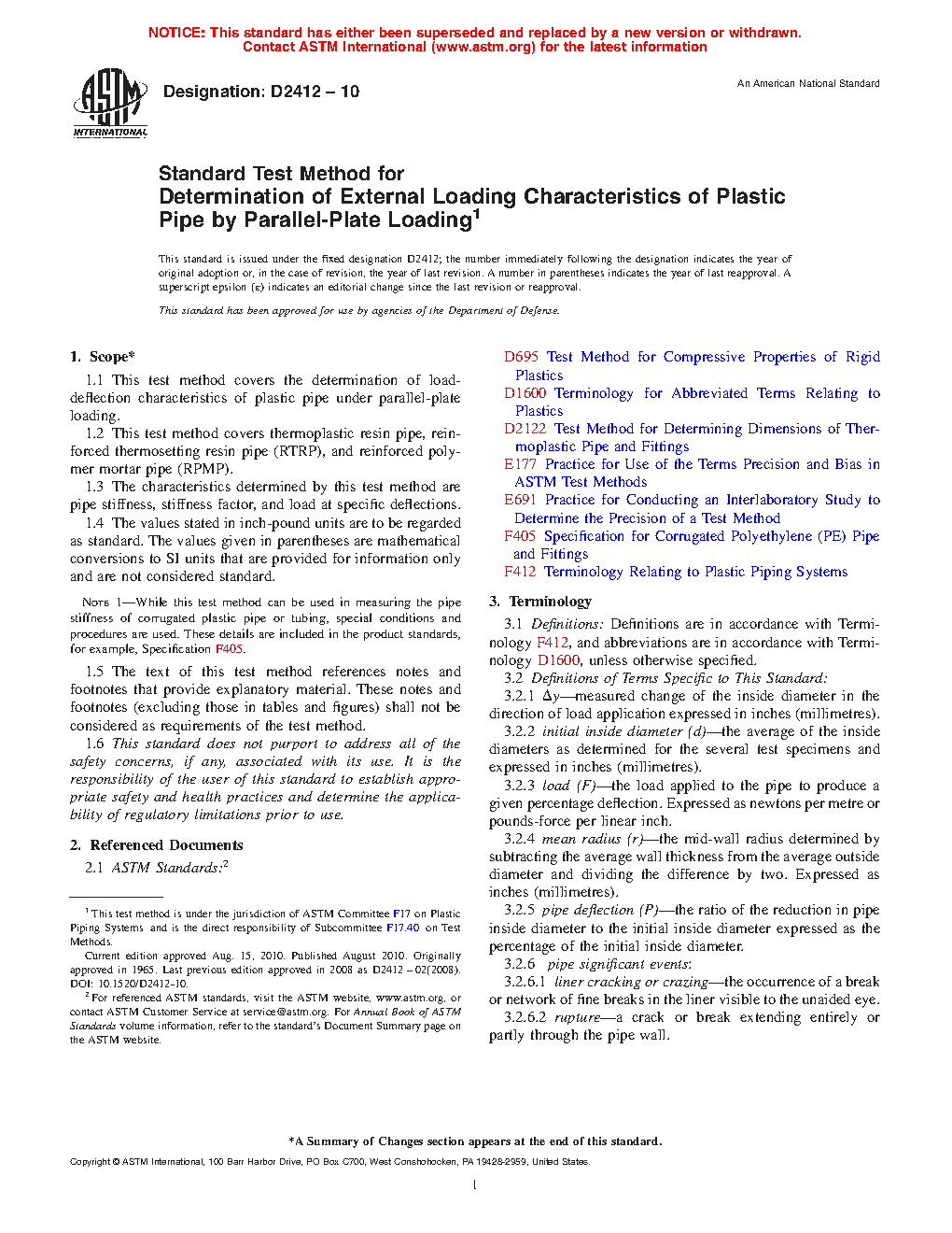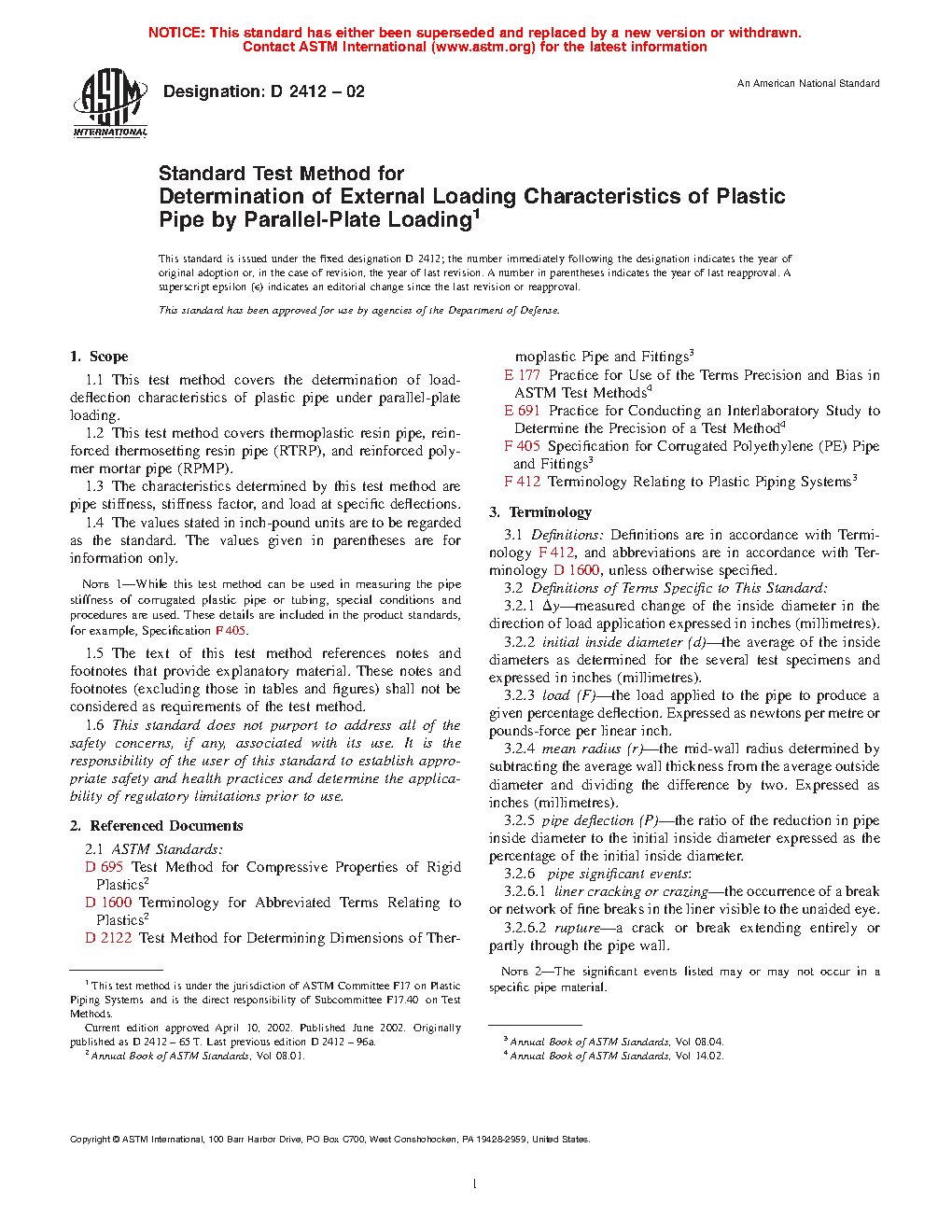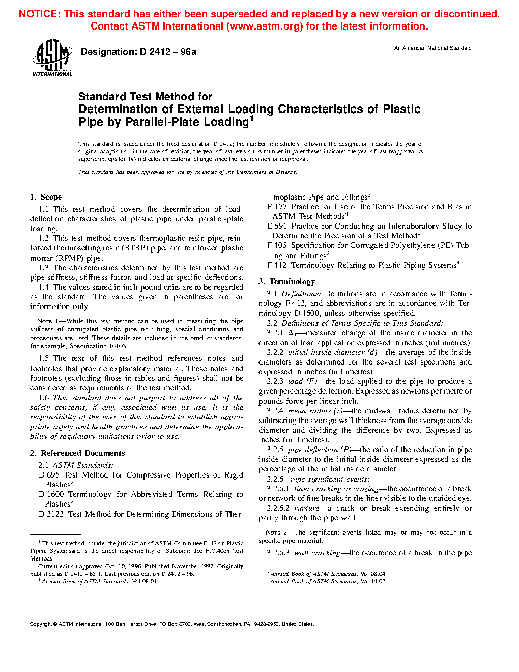 Note 1—While this test method can be used in measuring the pipe stiffness of corrugated plastic pipe or tubing, special conditions and procedures are used. These details are included in the product standards, for example, Specification F 405.