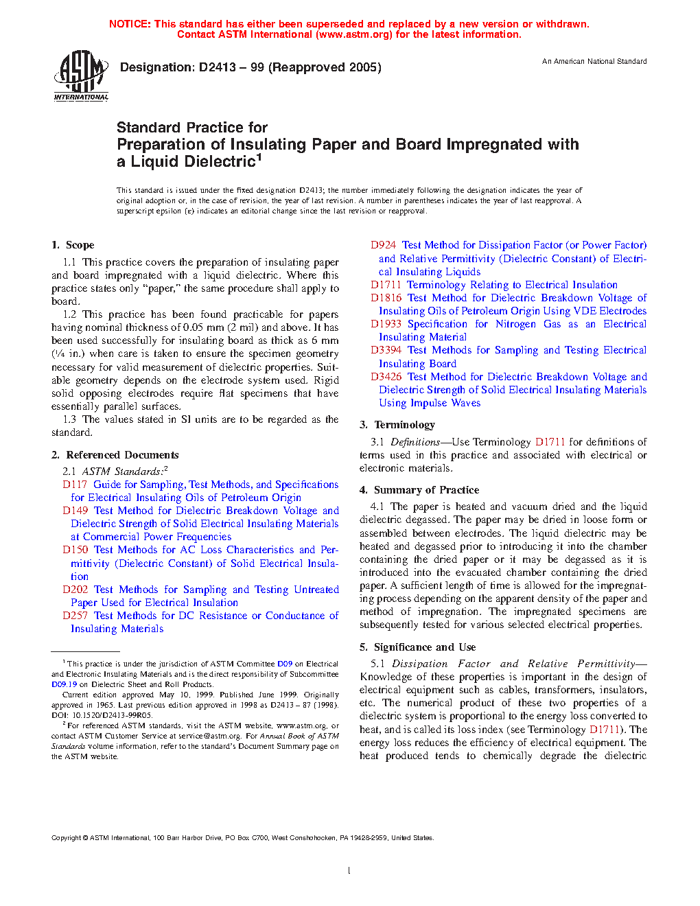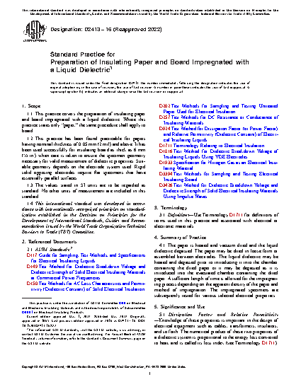 1.1 These test methods cover the preparation and electrical testing of insulating paper and board impregnated with a liquid dielectric. They provide for measuring dissipation factor (power factor), permittivity (dielectric constant), and dielectric strength. Where these methods state only "paper," the same procedure shall apply to board.