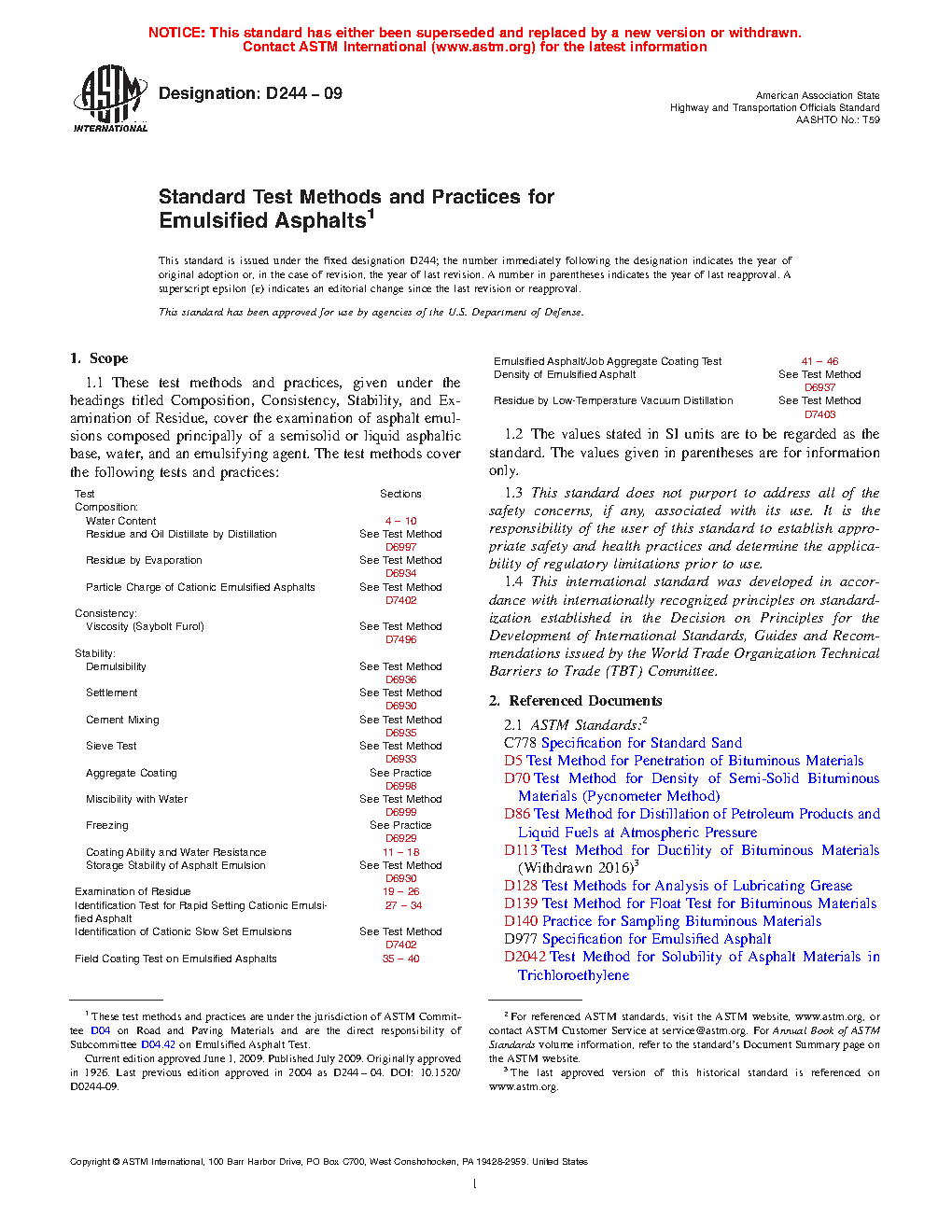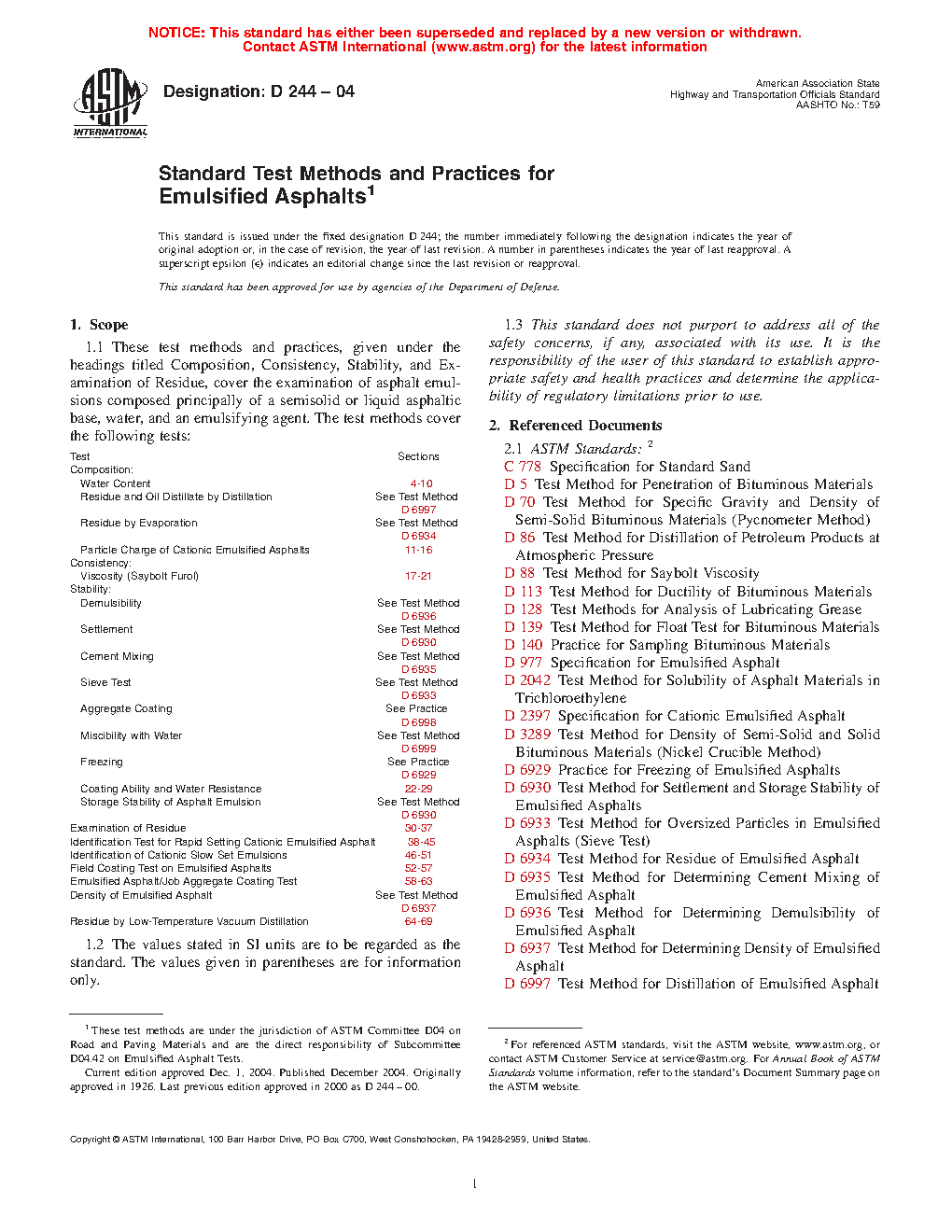 1.1 These test methods and practices, given under the headings titled Composition, Consistency, Stability, and Examination of Residue, cover the examination of asphalt emulsions composed principally of a semisolid or liquid asphaltic base, water, and an emulsifying agent. The test methods cover the following tests and practices: