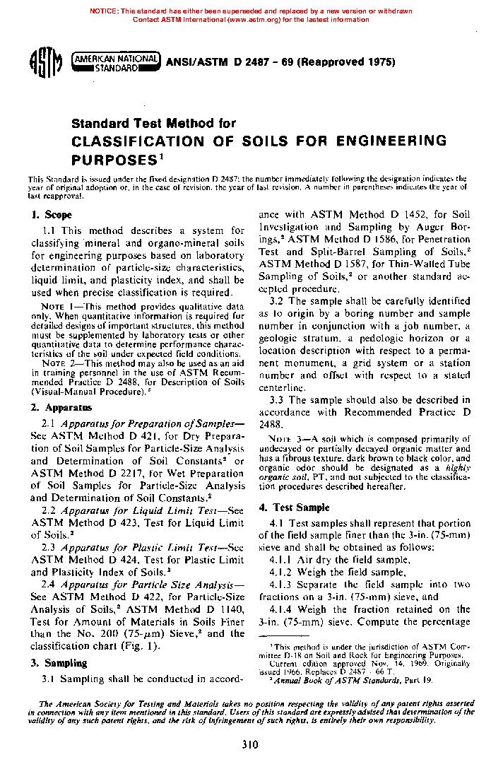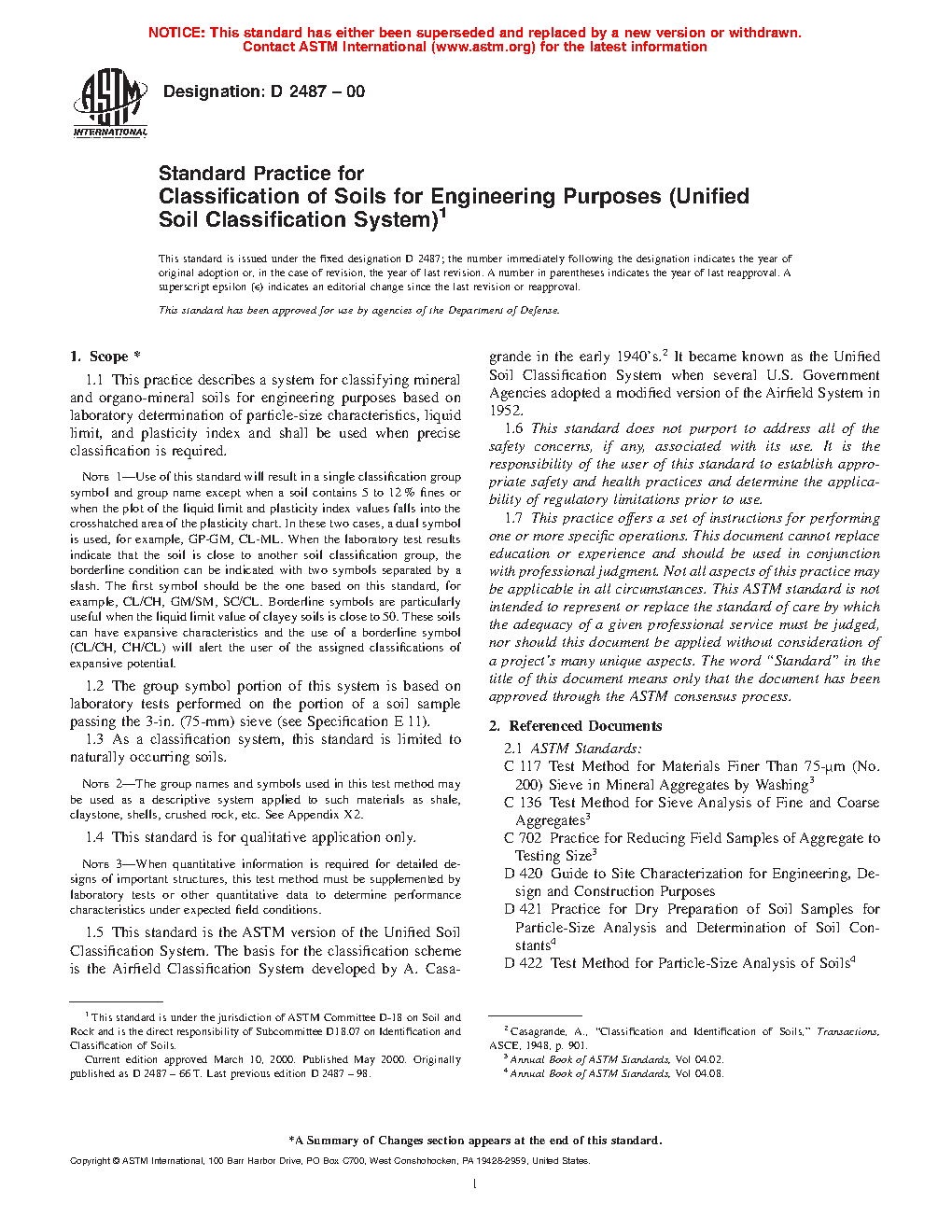 1.5 This standard is the ASTM version of the Unified Soil Classification System. The basis for the classification scheme is the Airfield Classification System developed by A. Casagrande in the early 1940s. It became known as the Unified Soil Classification System when several U.S. Government Agencies adopted a modified version of the Airfield System in 1952.