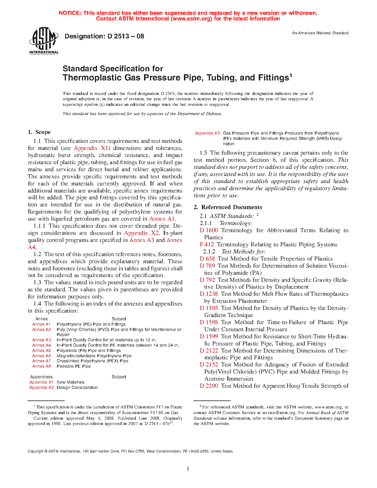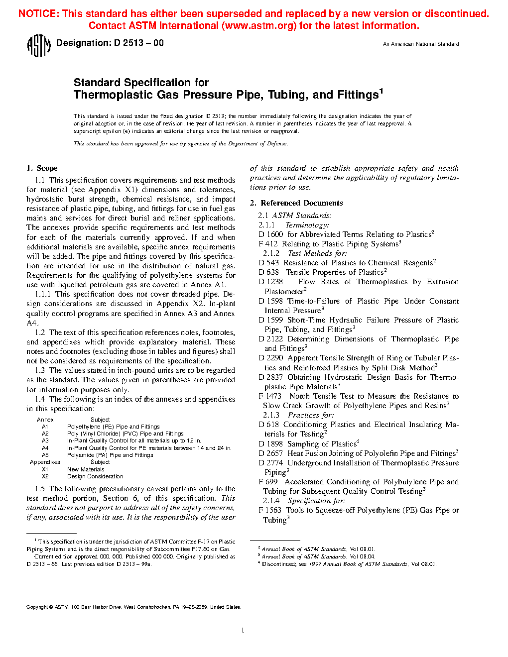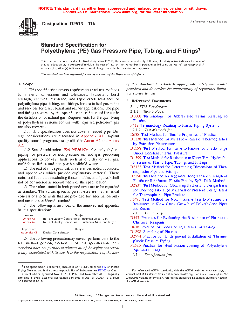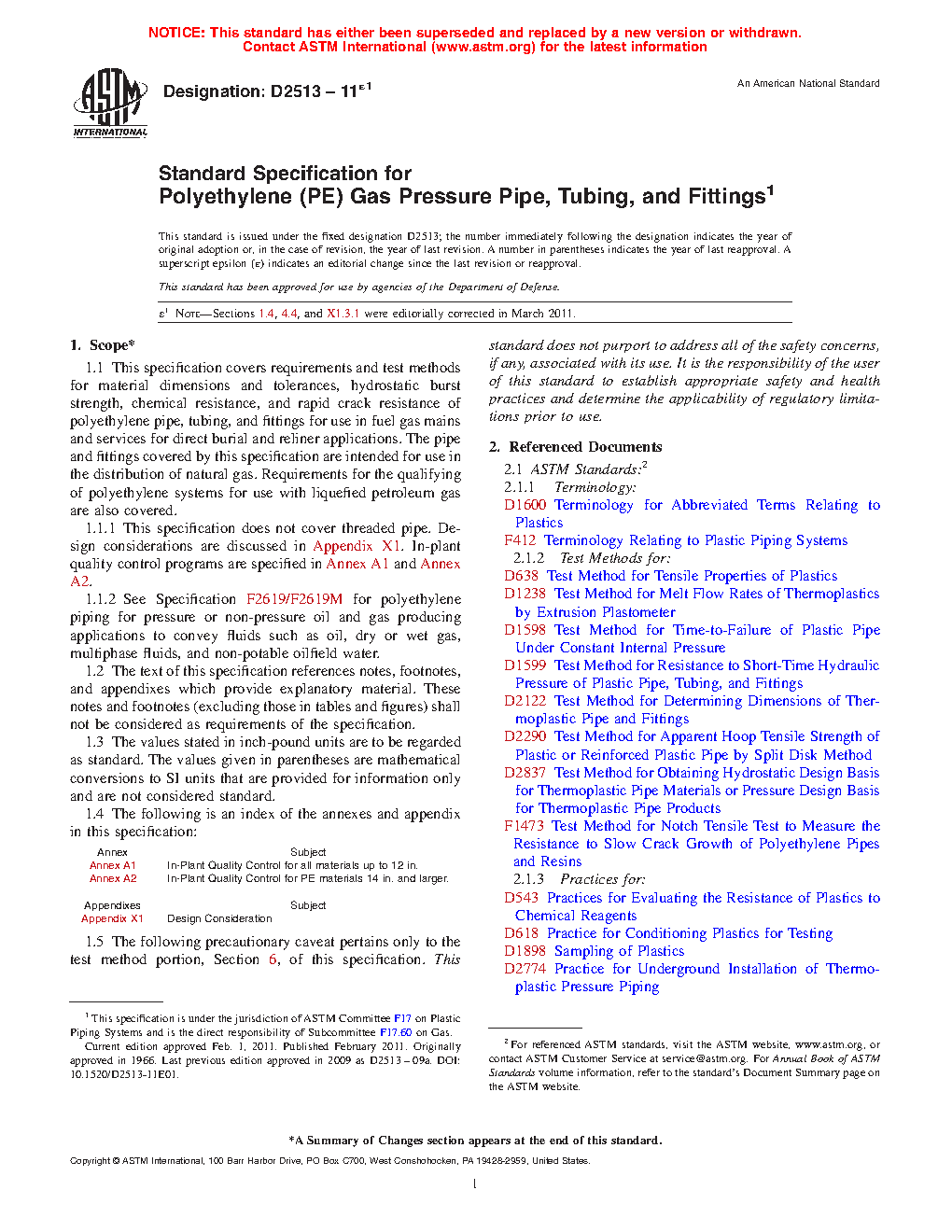 This specification covers the requirements and test methods for material, dimensions, hydrostatic burst strength, tensile strength, chemical resistance, sustained pressure, heat fusion, and impact resistance of plastic pipes, tubing, and fittings used for direct burial and reliner applications in fuel gas mains and services for the distribution of natural gas. This specification does not cover threaded pipe. The plastic used to make the pipes and fittings shall be virgin plastic or reworked plastic having Plastics Pipe Institute (PPI) long-term hydrostatic design stress and hydrostatic design basis rating.