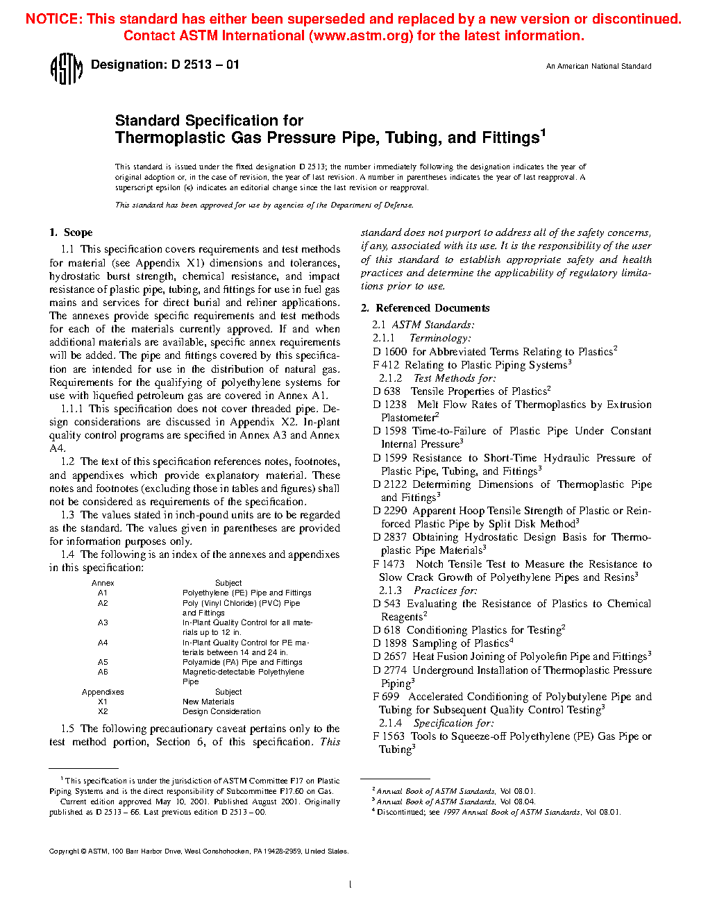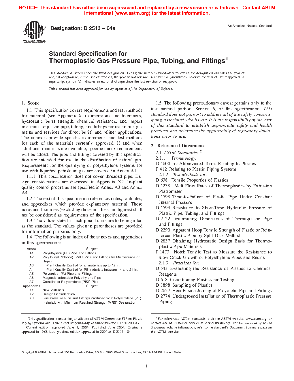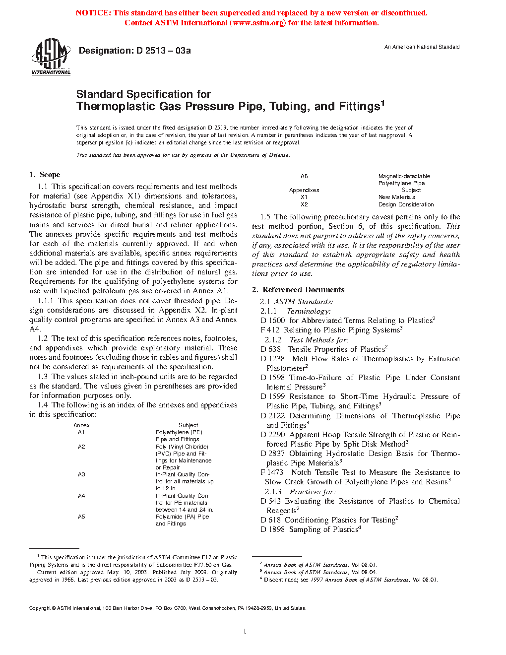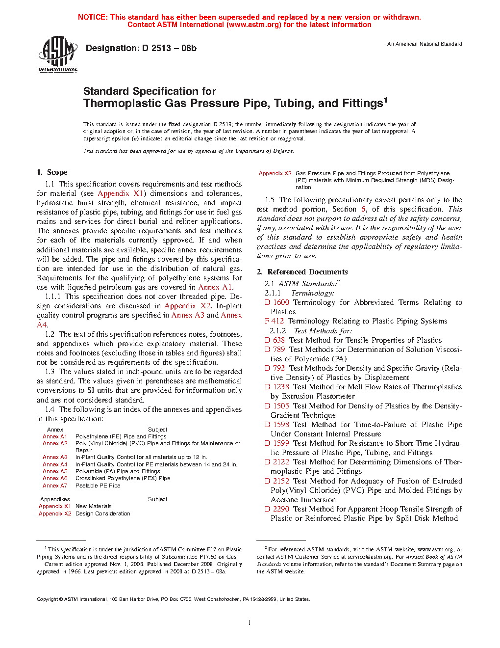 This specification covers the requirements and test methods for material, dimensions, hydrostatic burst strength, tensile strength, chemical resistance, sustained pressure, heat fusion, and impact resistance of plastic pipes, tubing, and fittings used for direct burial and reliner applications in fuel gas mains and services for the distribution of natural gas. This specification does not cover threaded pipe. The plastic used to make the pipes and fittings shall be virgin plastic or reworked plastic having Plastics Pipe Institute (PPI) long-term hydrostatic design stress and hydrostatic design basis rating.