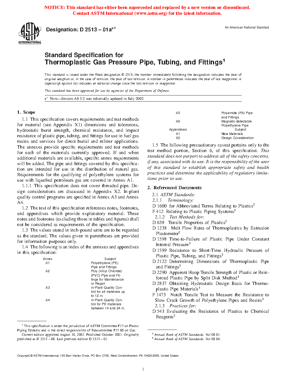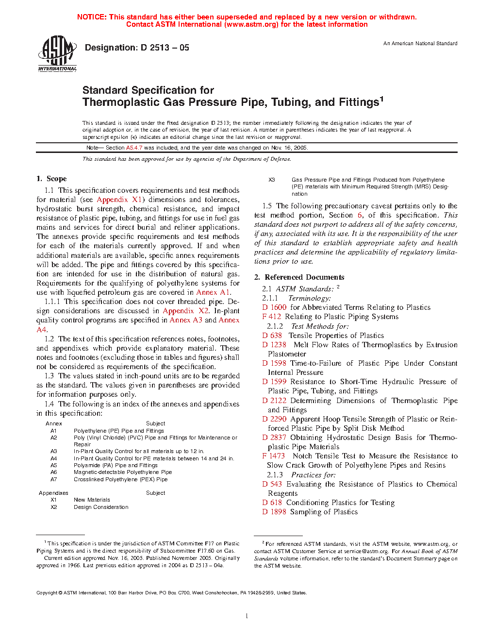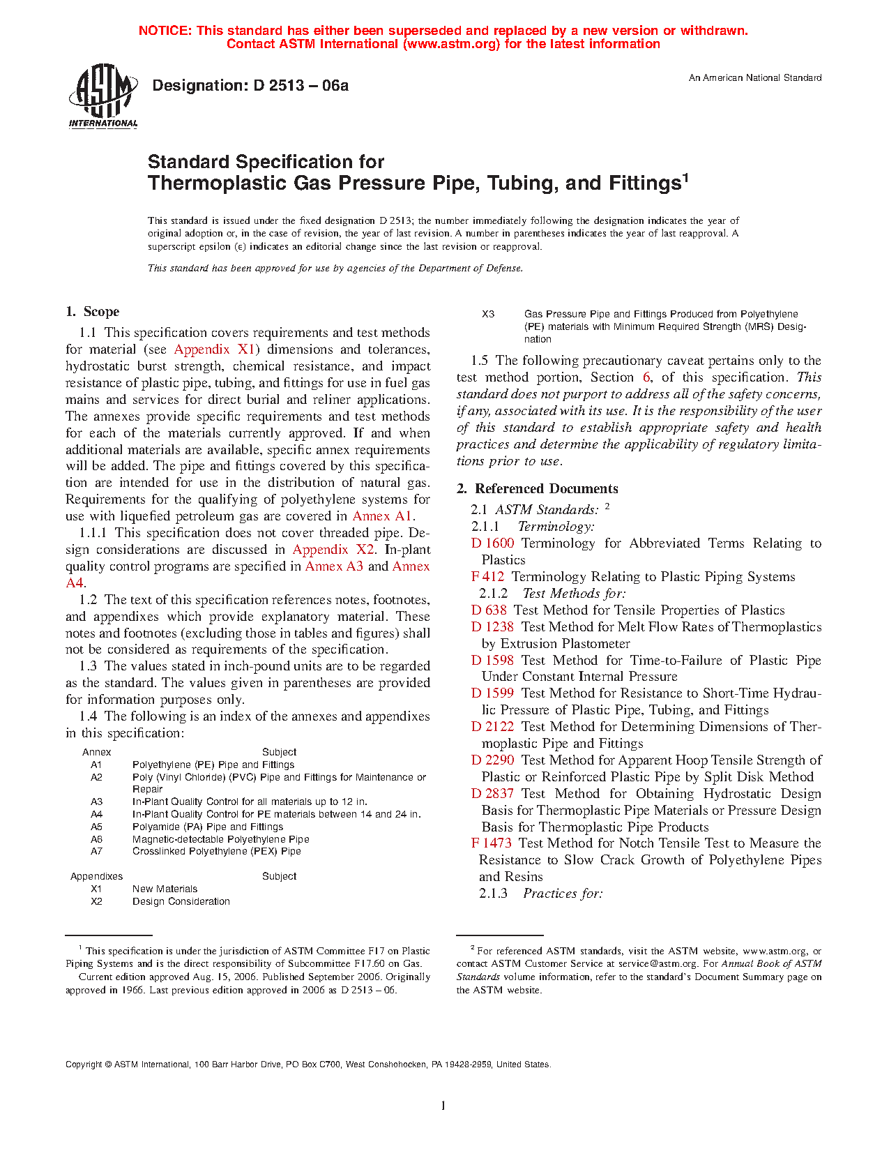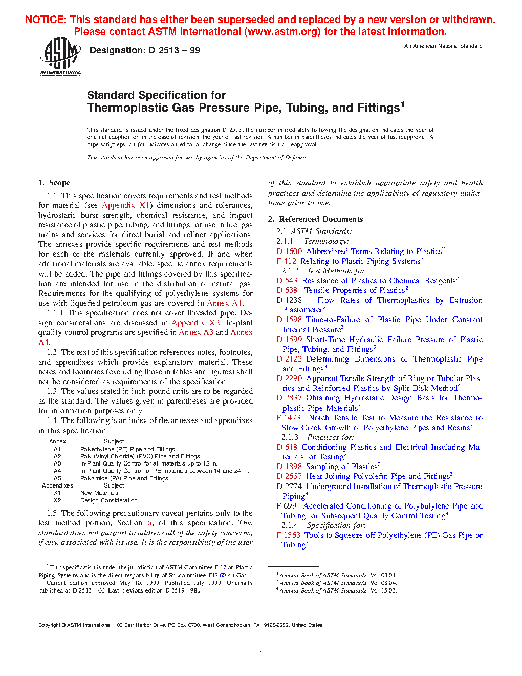 This specification covers the requirements and test methods for material, dimensions, hydrostatic burst strength, tensile strength, chemical resistance, sustained pressure, heat fusion, and impact resistance of plastic pipes, tubing, and fittings used for direct burial and reliner applications in fuel gas mains and services for the distribution of natural gas. This specification does not cover threaded pipe. The plastic used to make the pipes and fittings shall be virgin plastic or reworked plastic having Plastics Pipe Institute (PPI) long-term hydrostatic design stress and hydrostatic design basis rating.