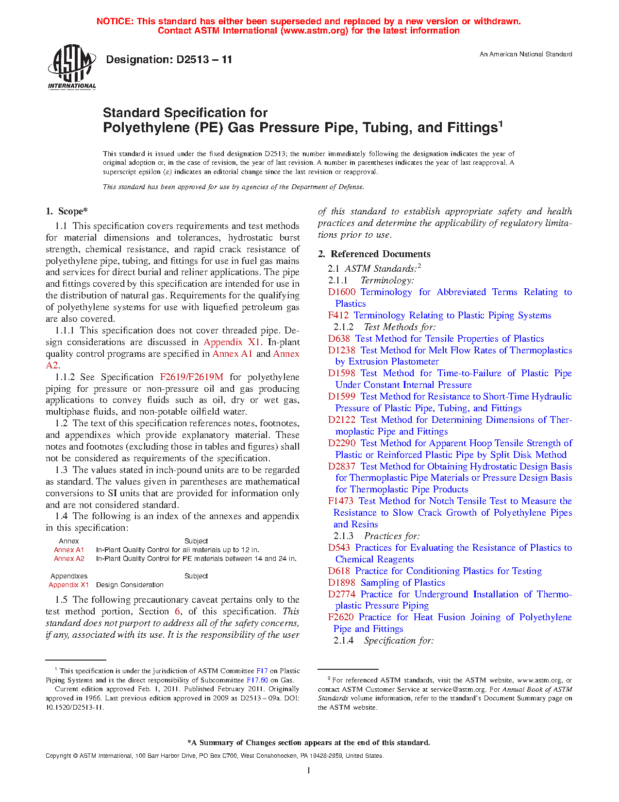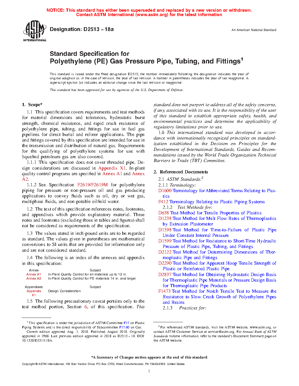 1.1 This specification covers requirements and test methods for material dimensions and tolerances, hydrostatic burst strength, chemical resistance, and rapid crack resistance of polyethylene pipe, tubing, and fittings for use in fuel gas pipelines for direct burial and reliner applications. The pipe and fittings covered by this specification are intended for use in the transmission and distribution of natural gas. Requirements for the qualifying of polyethylene systems for use with liquefied petroleum gas are also covered.