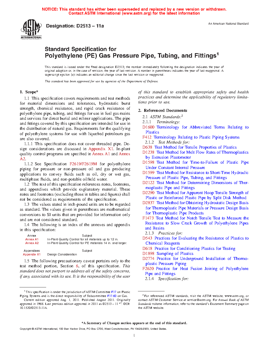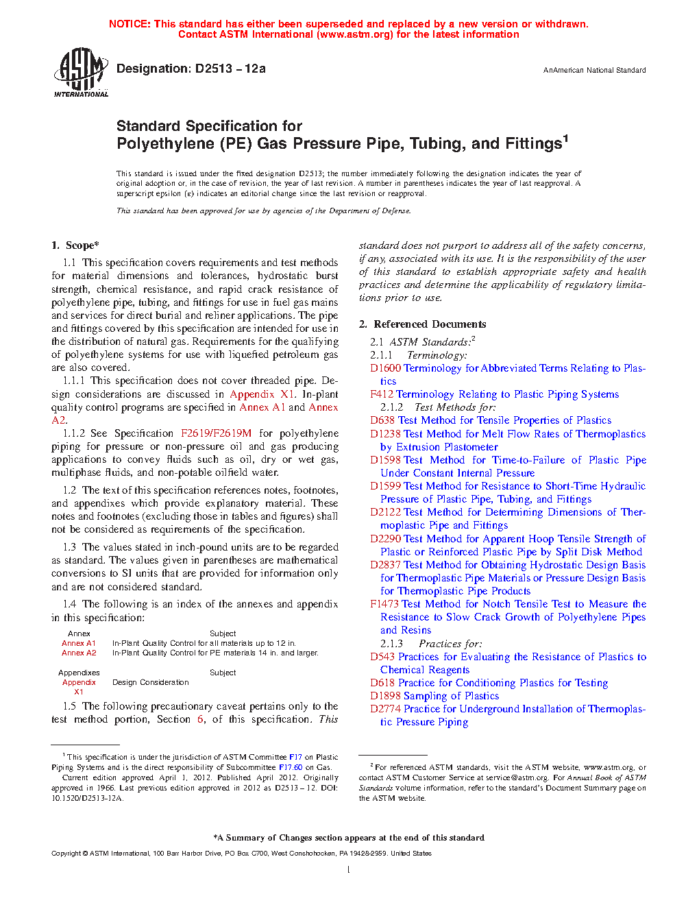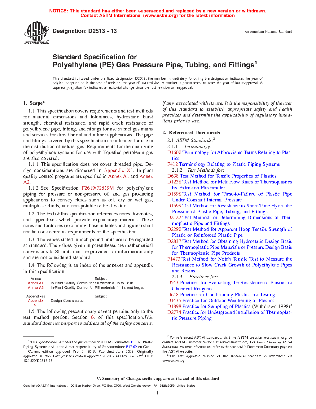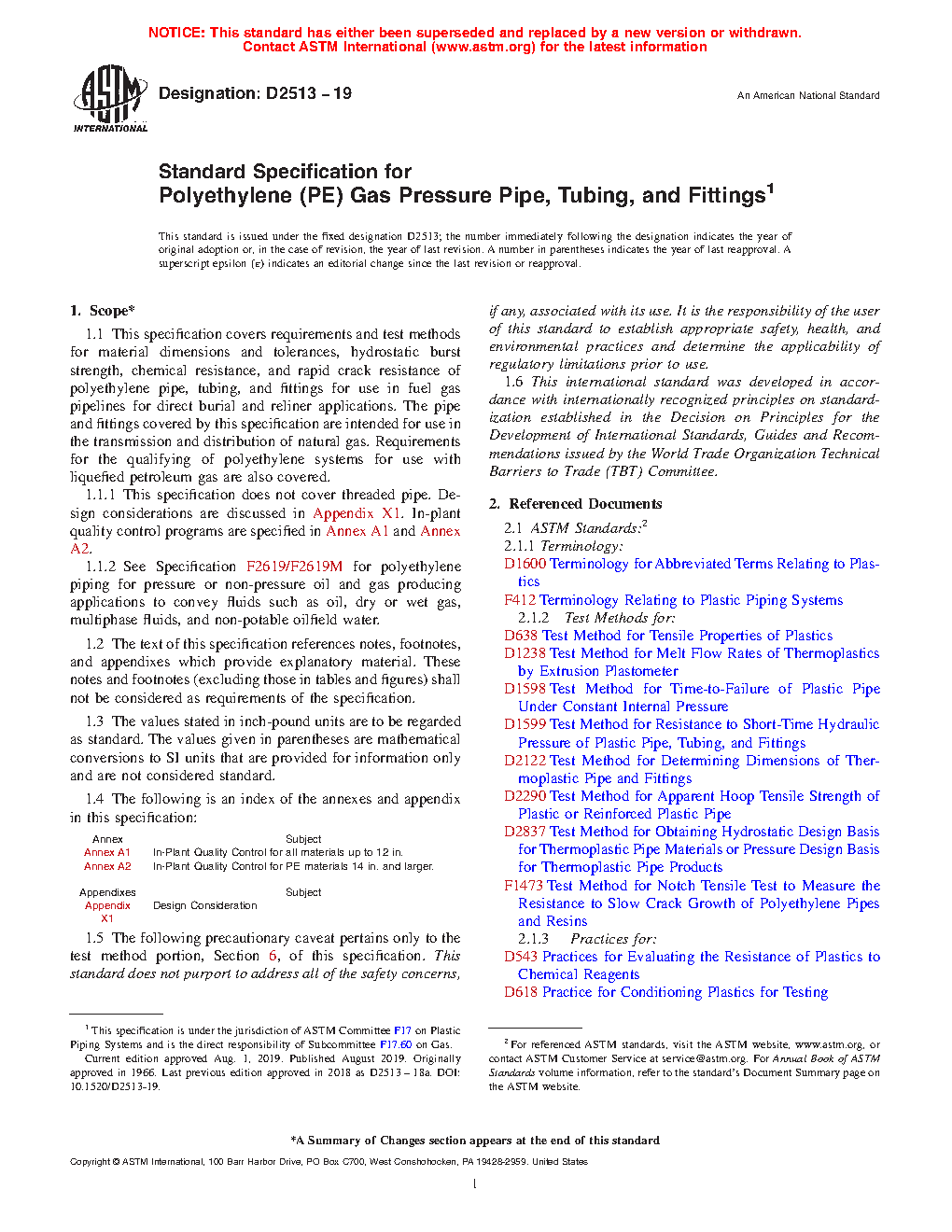 1.1.2 Requirements for polyethylene piping for pressure or non-pressure oil and gas producing applications to convey fluids such as oil, dry or wet gas, multiphase fluids, and non-potable oilfield water are addressed in Specification F2619/F2619M.