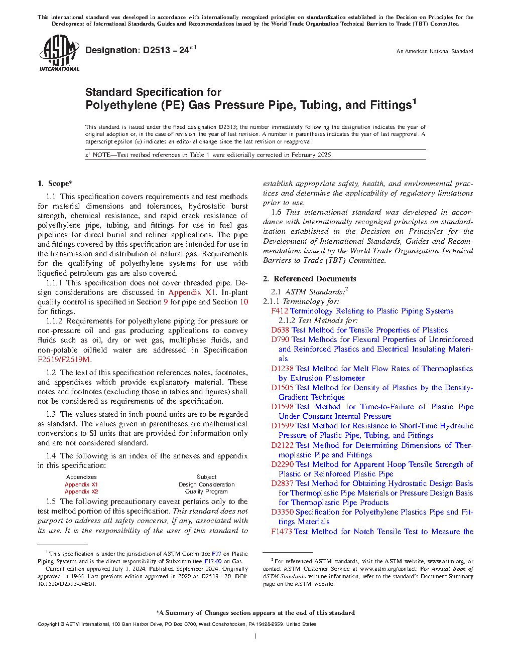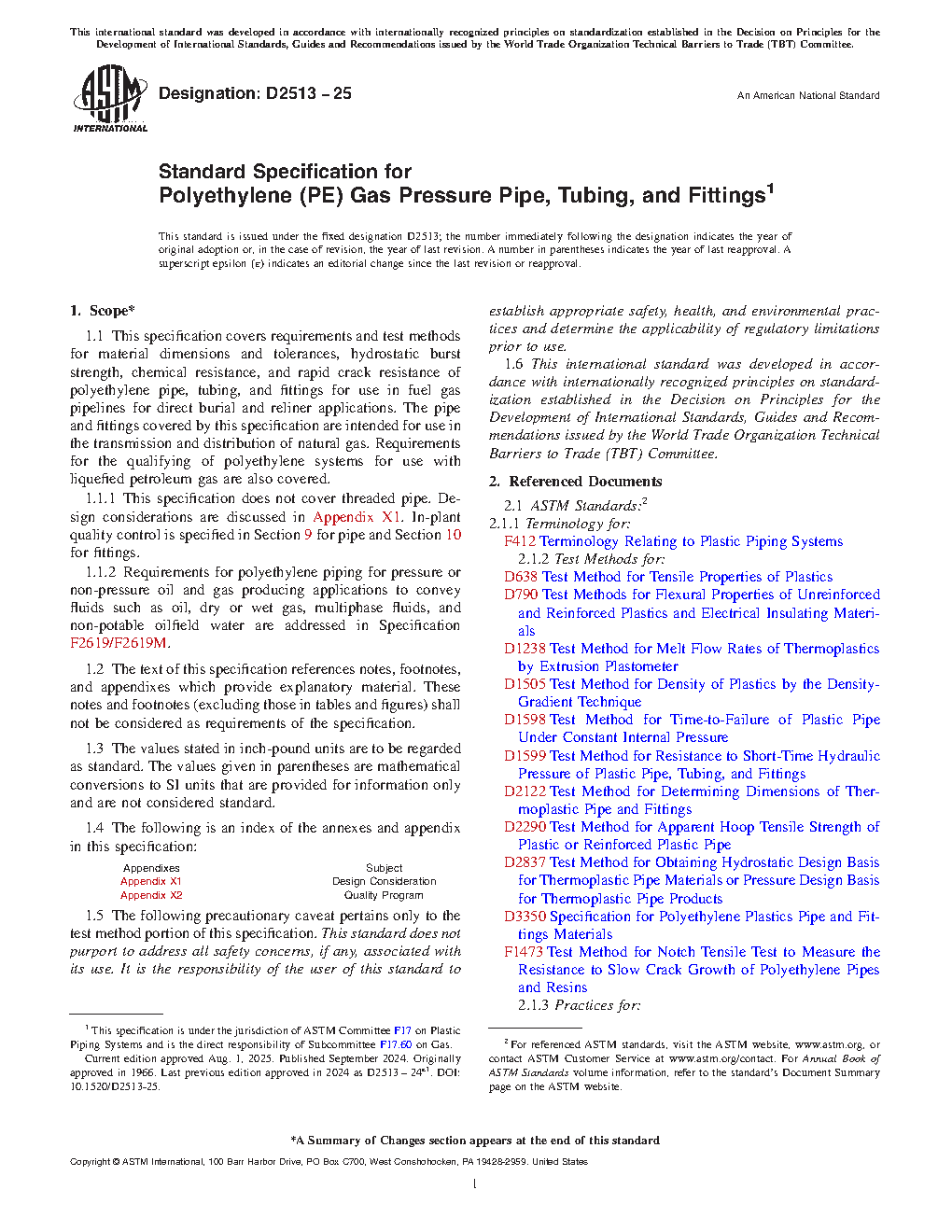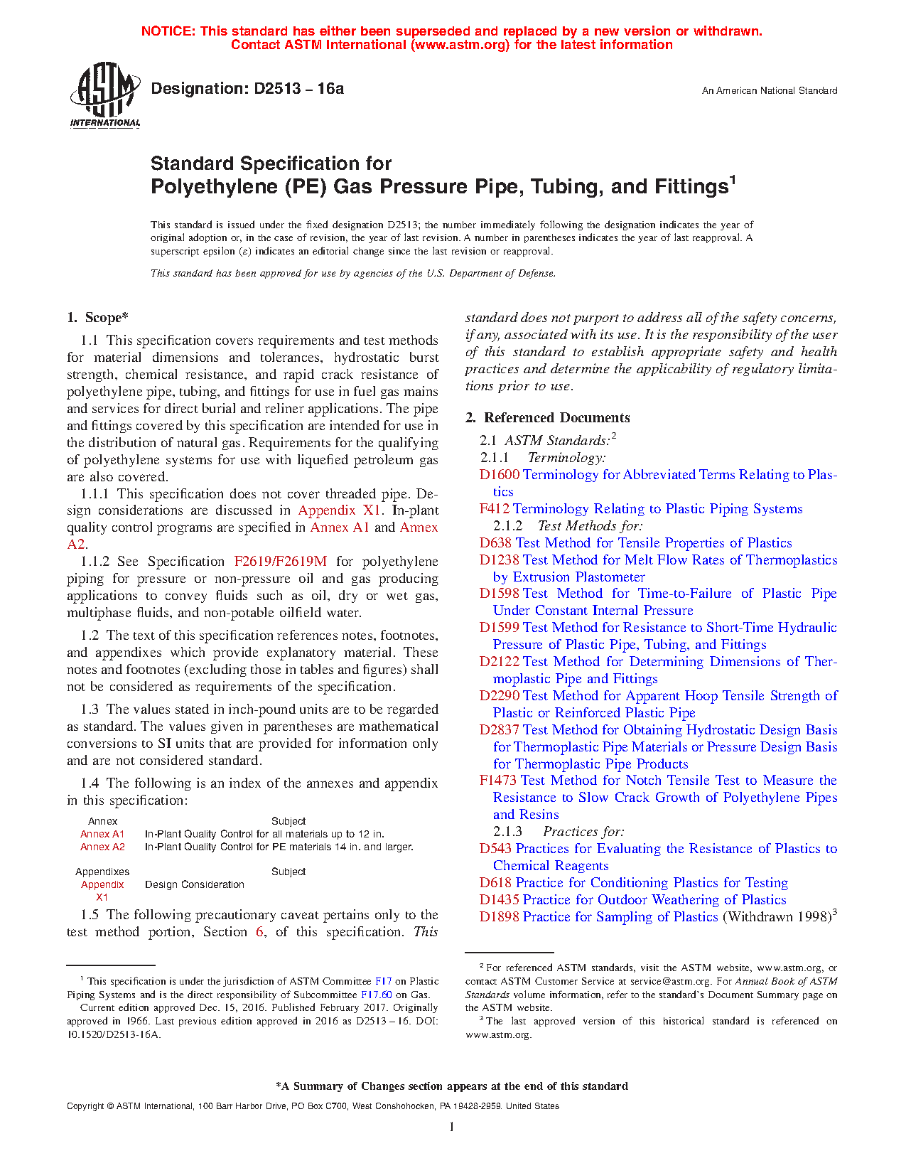 1.1.2 Requirements for polyethylene piping for pressure or non-pressure oil and gas producing applications to convey fluids such as oil, dry or wet gas, multiphase fluids, and non-potable oilfield water are addressed in Specification F2619/F2619M.