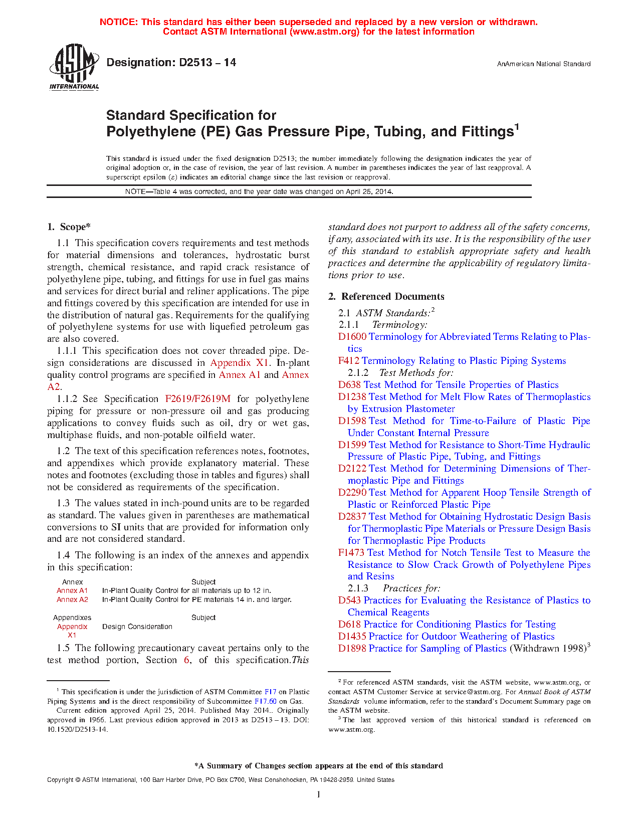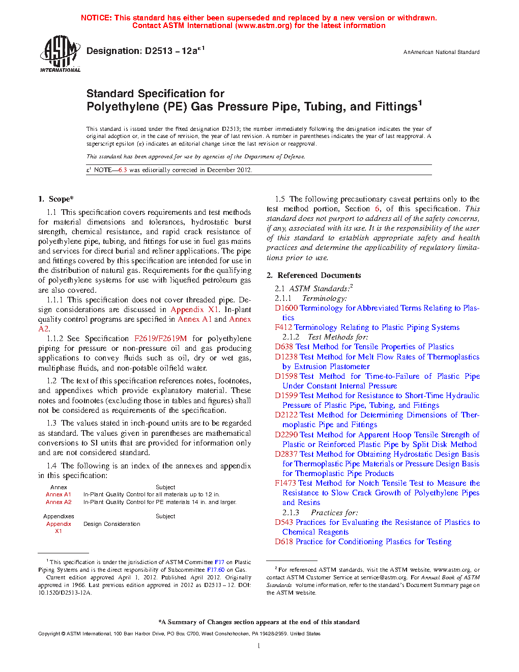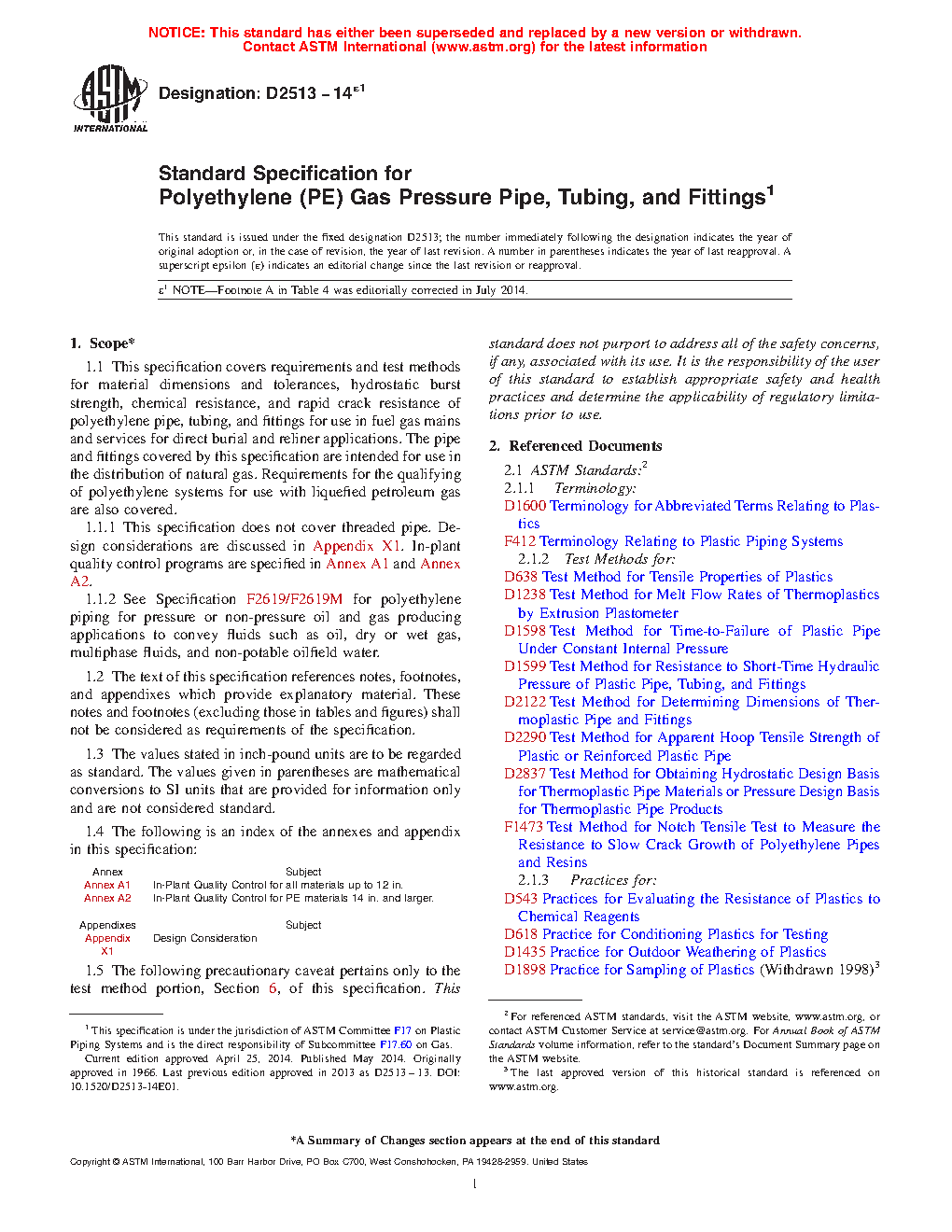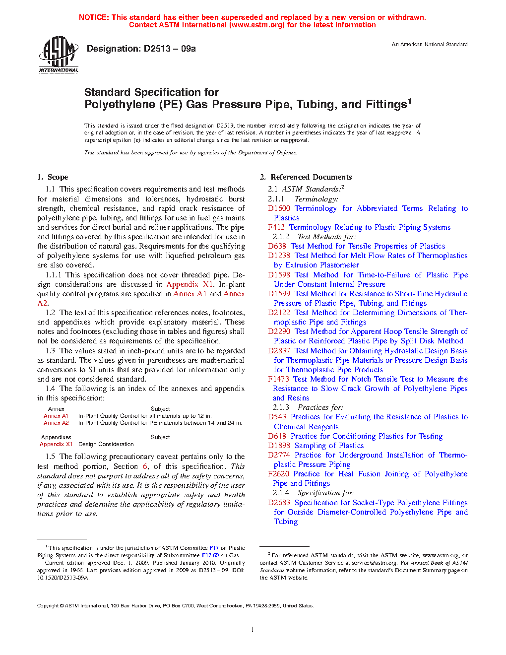 1.1.2 Requirements for polyethylene piping for pressure or non-pressure oil and gas producing applications to convey fluids such as oil, dry or wet gas, multiphase fluids, and non-potable oilfield water are addressed in Specification F2619/F2619M.