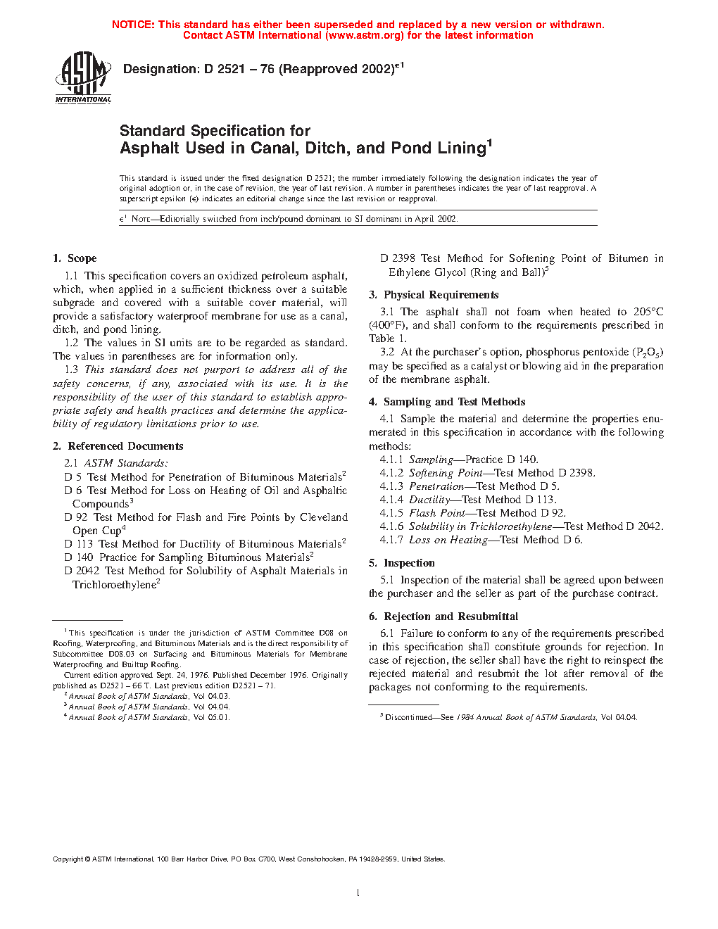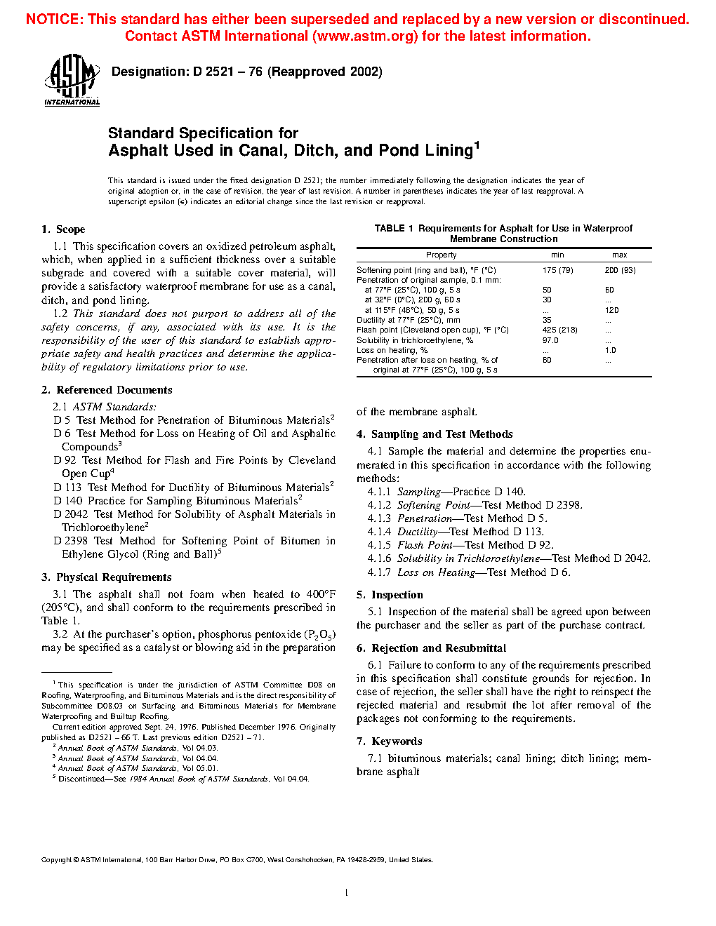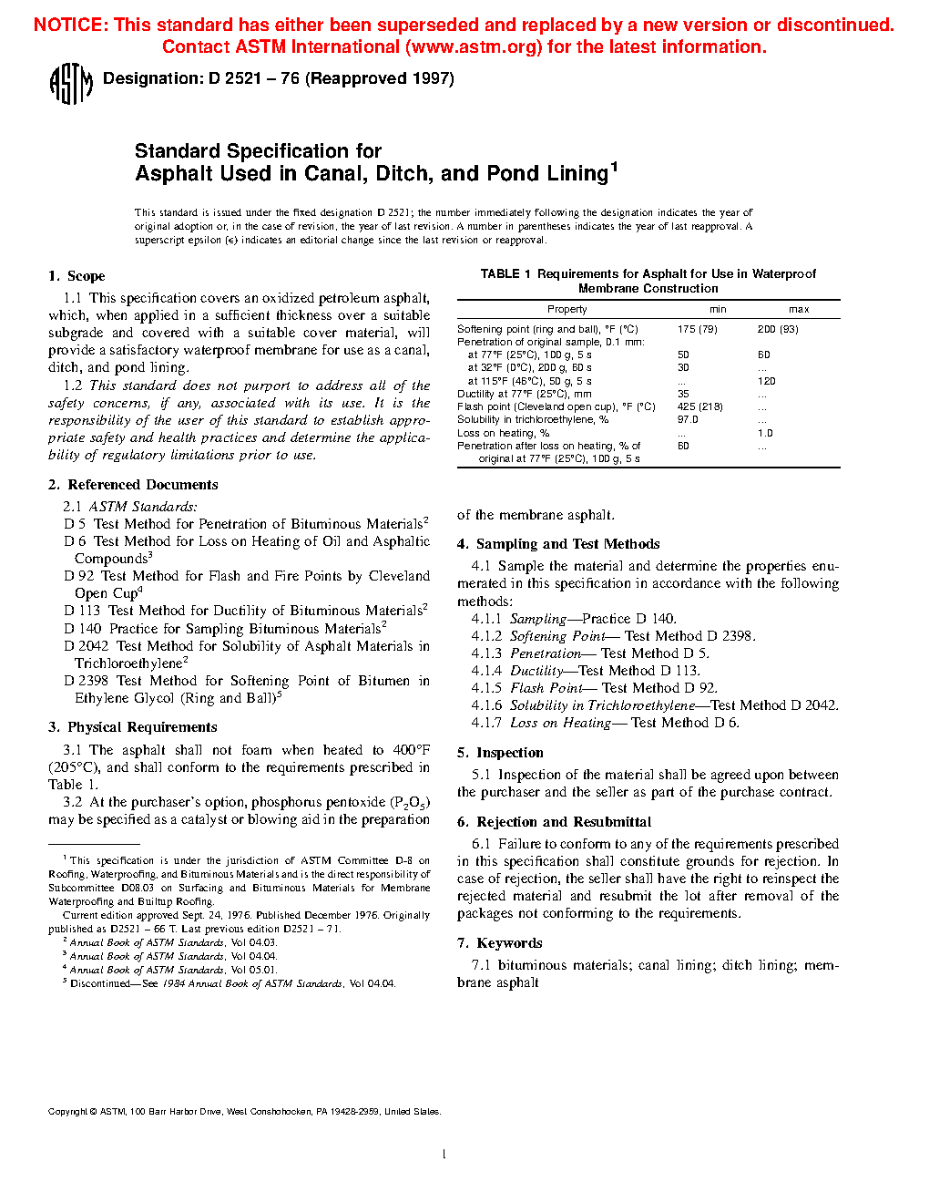This specification covers the sampling, testing, and physical requirements of oxidized petroleum asphalt, which when applied in a sufficient thickness over a suitable subgrade and covered with a suitable cover material, will provide a satisfactory waterproof membrane for use as a canal, ditch, and pond lining. The asphalt shall not foam when heated are a specified temperature, when tested using appropriate methods, shall conform accordingly to the following properties: softening point (ring and ball); penetration points; ductility; flash point (Cleveland open cup); solubility in trichloroethylene; and loss in heating.
