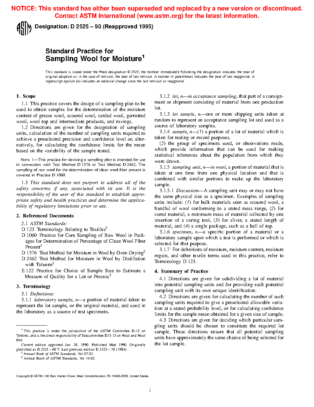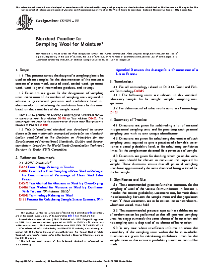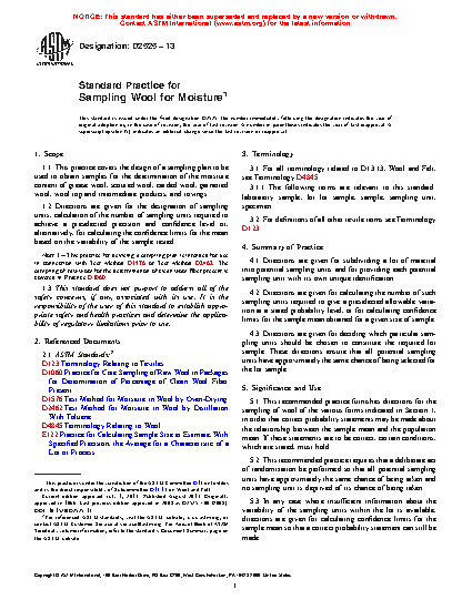 1.1 This practice covers the design of a sampling plan to be used to obtain samples for the determination of the moisture content of grease wool, scoured wool, carded wool, garnetted wool, wool top and intermediate products, and rovings.