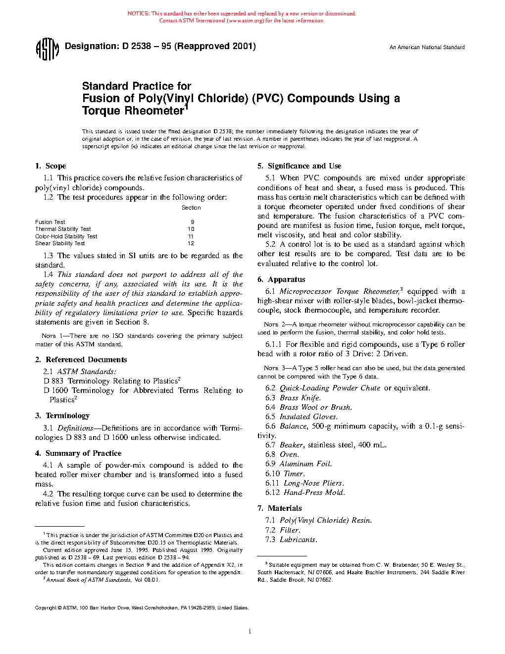 When PVC compounds are mixed under appropriate conditions of heat and shear, a fused mass is produced. This mass has certain melt characteristics which can be defined with a torque rheometer operated under fixed conditions of shear and temperature. The fusion characteristics of a PVC compound are manifest as fusion time, fusion torque, melt torque, melt viscosity, and heat and color stability.