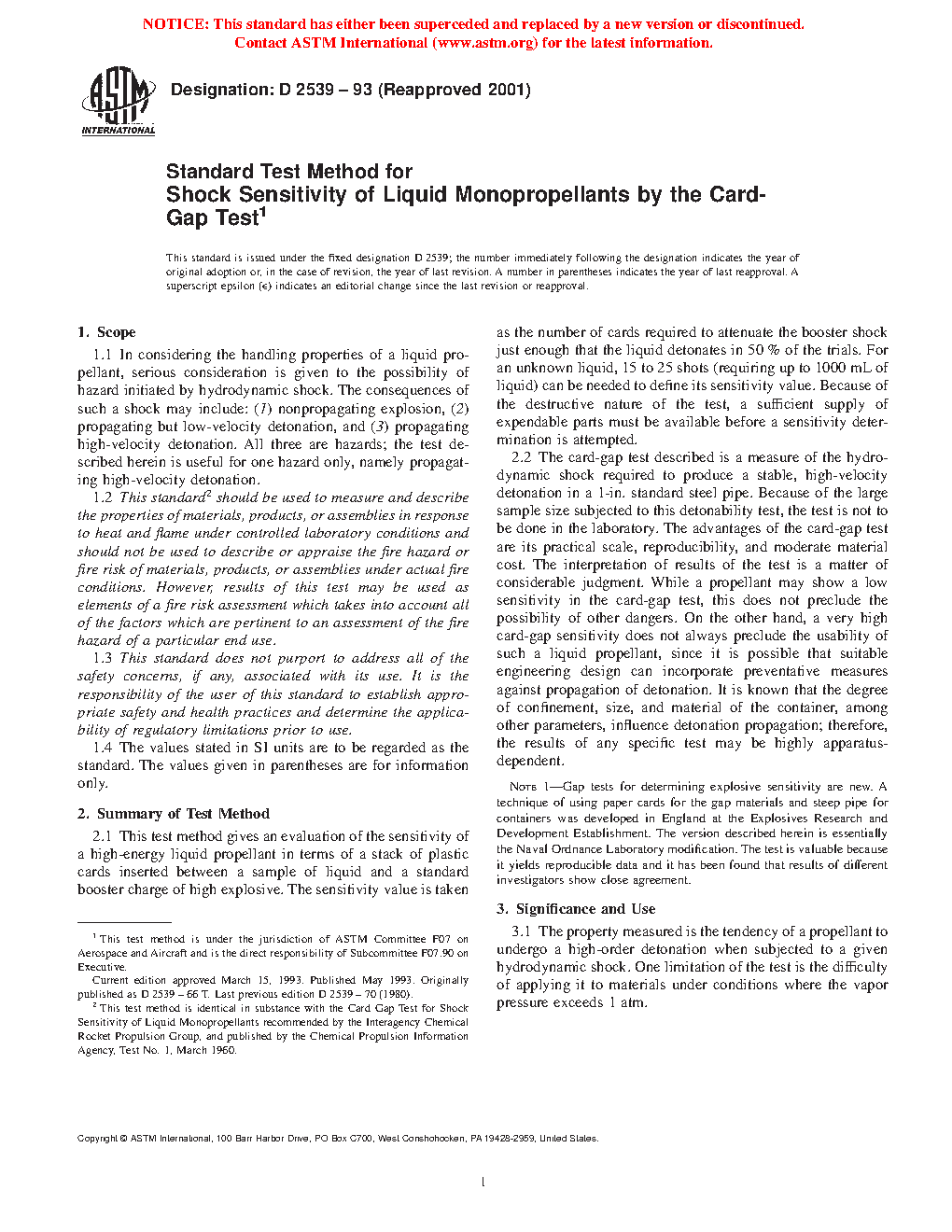 1.1 In considering the handling properties of a liquid propellant, serious consideration is given to the possibility of hazard initiated by hydrodynamic shock. The consequences of such a shock may include: (