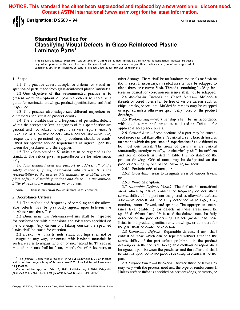 This practice covers acceptance criteria for visual inspection of parts made from glass-reinforced plastic laminates. It presents word descriptions of possible defects to serve as a guide for contracts, drawings, product specifications, and final inspection. This practice also categorizes different inspection requirements for levels of product quality. The acceptance criteria shall be applied to the following: dimensions and tolerances, inserts, molded-in threads or cored holes, workmanship, critical area, allowable visual defects, repairable defects, surface finish, and surface appearance. Four acceptance levels for visual inspection are described: Acceptance Level I, Acceptance Level II, Acceptance Level III, and Acceptance Level IV.