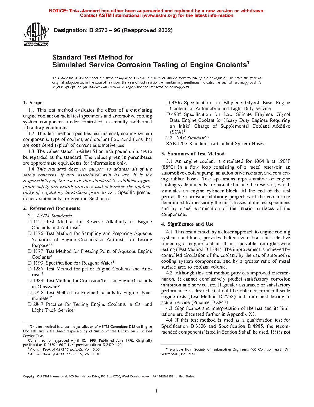 1.1 This test method evaluates the effect of a circulating engine coolant on metal test specimens and automotive cooling system components under controlled, essentially isothermal laboratory conditions.