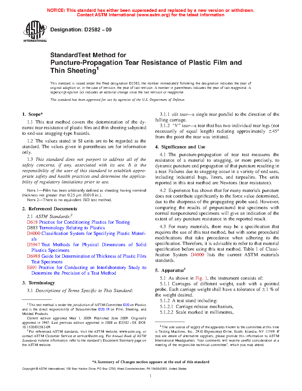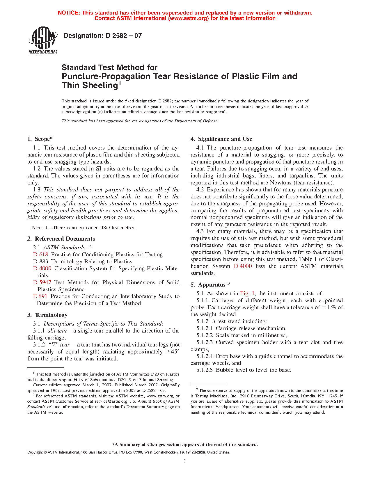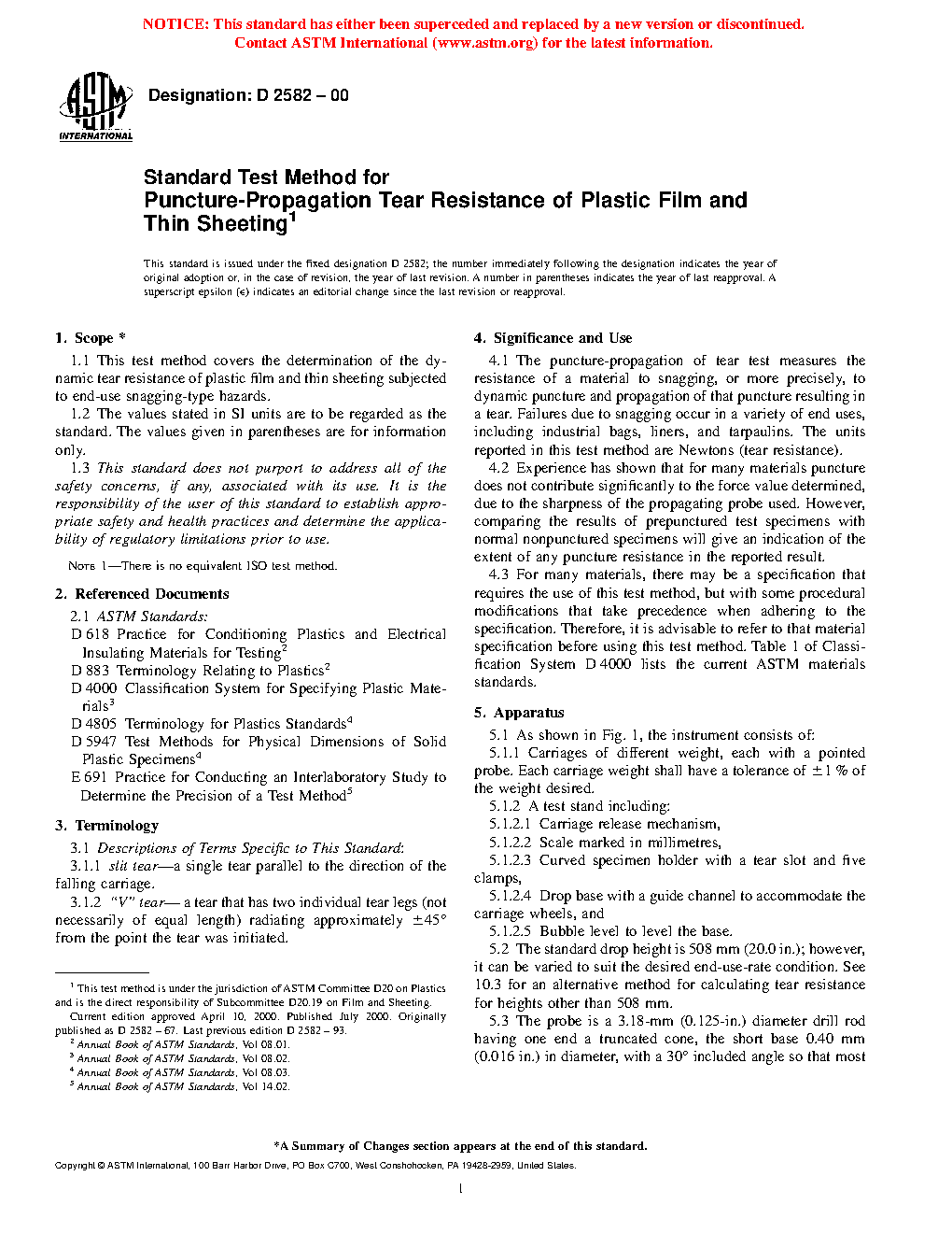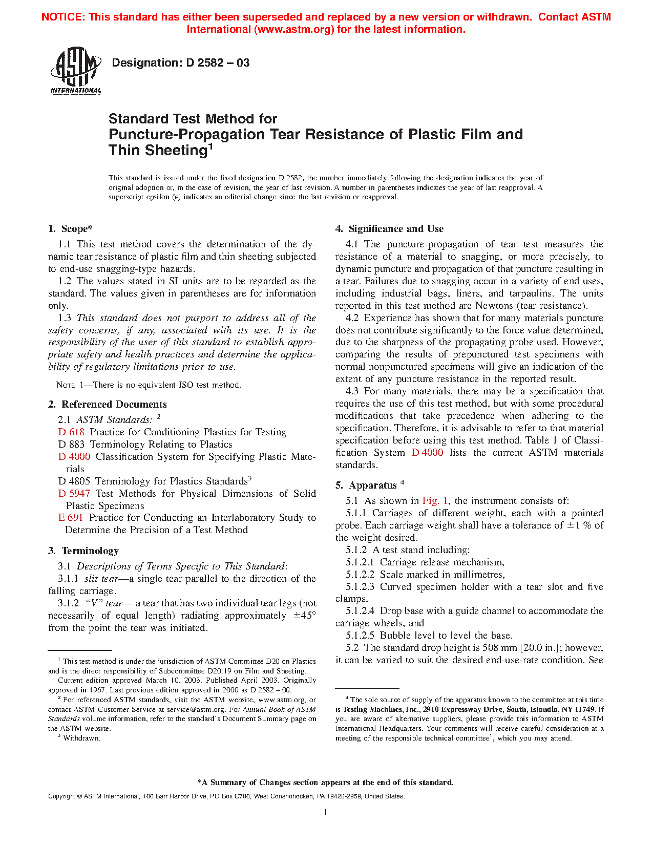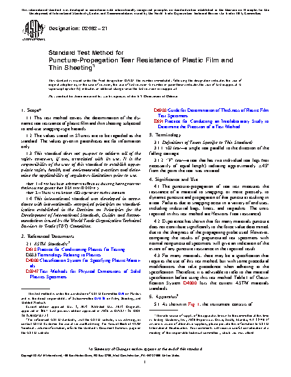 Standard Test Method for Puncture-Propagation Tear Resistance of Plastic Film and Thin Sheeting