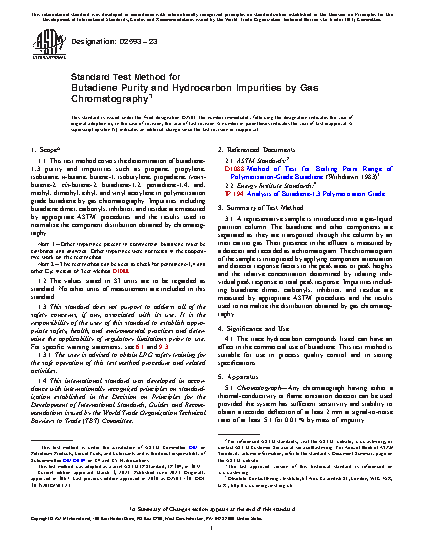 1.1 This test method covers the determination of butadiene-1,3 purity and impurities such as propane, propylene, isobutane, n-butane, butene-1, isobutylene, propadiene, trans-butene-2, cis-butene-2, butadiene-1,2, pentadiene-1,4, and, methyl, dimethyl, ethyl, and vinyl acetylene in polymerization grade butadiene by gas chromatography. Impurities including butadiene dimer, carbonyls, inhibitor, and residue are measured by appropriate ASTM procedures and the results used to normalize the component distribution obtained by chromatography.