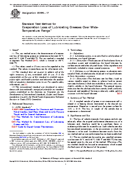 1.1 This test method covers the determination of evaporation loss of lubricating greases at temperatures between 93 °C and 316 °C (200 °F and 600 °F). This test method is intended to augment Test Method D972, which is limited to 149 °C (300 °F).