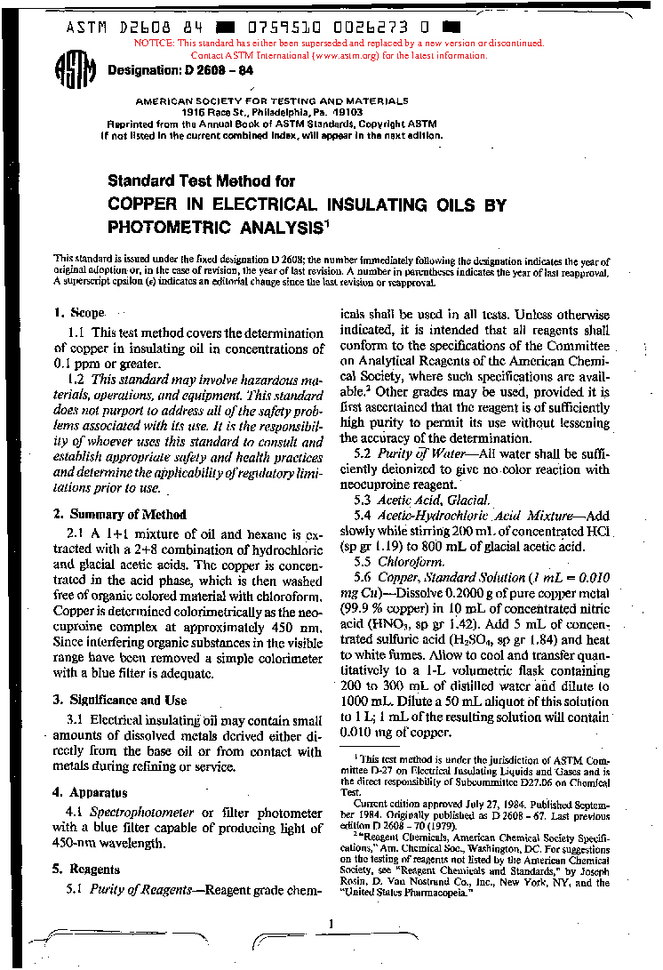Method of Test for Copper in Electrical Insulating Oils by Photometric Analysis (Withdrawn 1989)