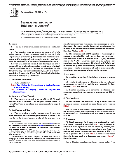 4.1 This test method is useful in determining the approximate amount of nonvolatile inorganic material in leather. This may be in the form of salts or oxides of the elements. In a mixed chrome tannage, the approximate percentage of other elements in the leather may be determined by subtracting the chromic oxide that may be conveniently determined on the ash. (See Test Method D2807.)
