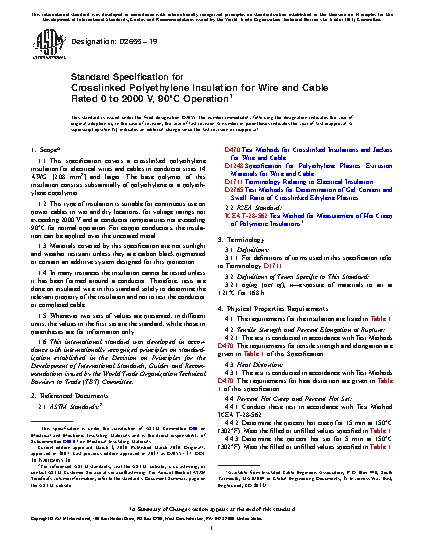 1.1 This specification covers a crosslinked polyethylene insulation for electrical wires and cables in conductor sizes 14 AWG [2.08 mm2] and larger. The base polymer of this insulation consists substantially of polyethylene or a polyethylene copolymer.