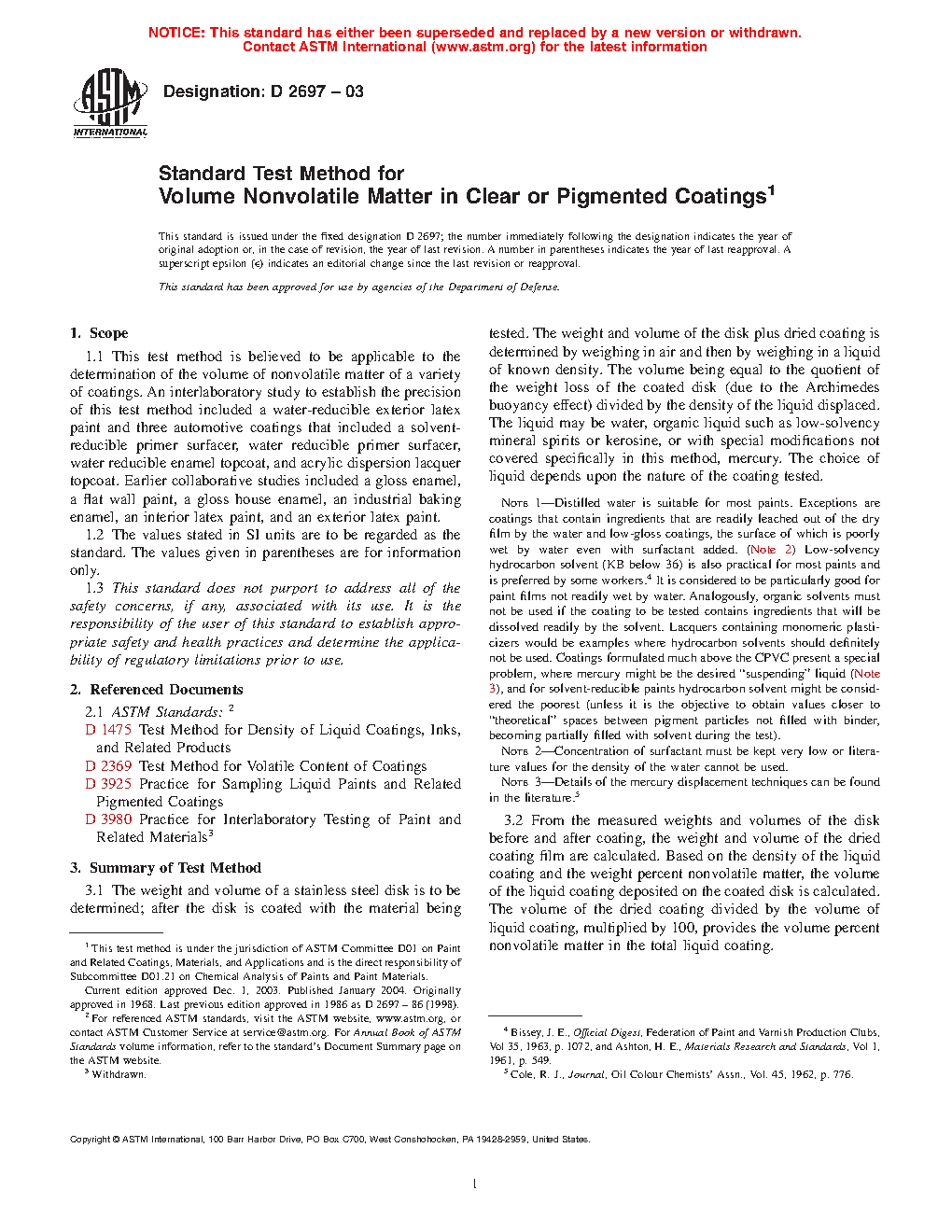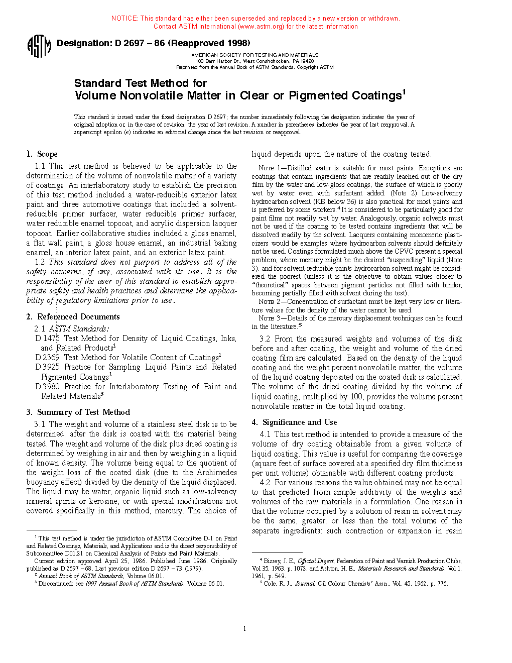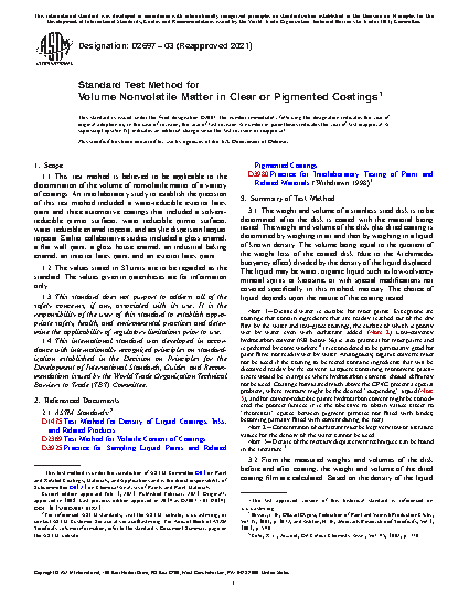 1.1 This test method is believed to be applicable to the determination of the volume of nonvolatile matter of a variety of coatings. An interlaboratory study to establish the precision of this test method included a water-reducible exterior latex paint and three automotive coatings that included a solvent-reducible primer surfacer, water reducible primer surfacer, water reducible enamel topcoat, and acrylic dispersion lacquer topcoat. Earlier collaborative studies included a gloss enamel, a flat wall paint, a gloss house enamel, an industrial baking enamel, an interior latex paint, and an exterior latex paint.