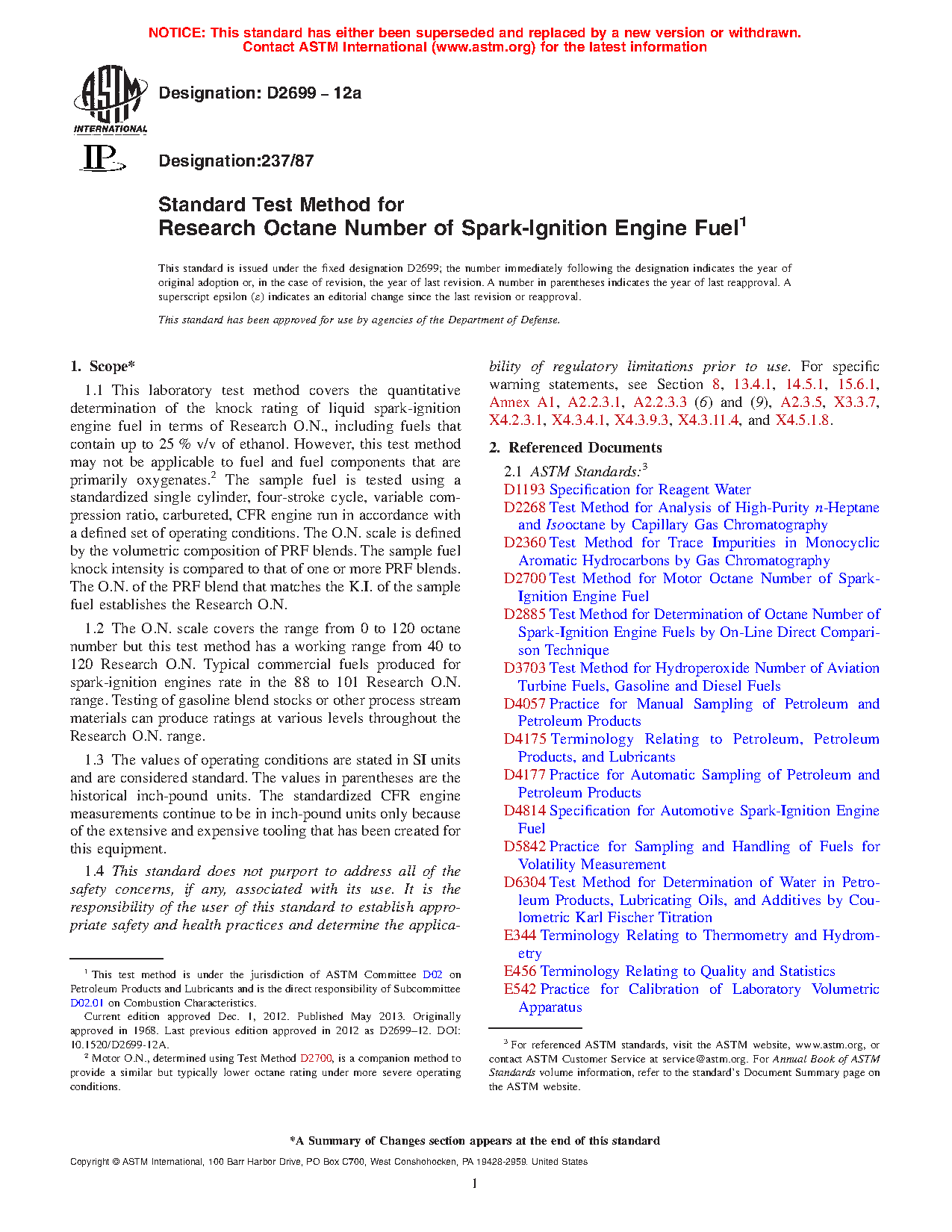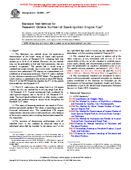 1.1 This laboratory test method covers the quantitative determination of the knock rating of liquid spark-ignition engine fuel in terms of Research O.N., including fuels that contain up to 25 % v/v of ethanol. However, this test method may not be applicable to fuel and fuel components that are primarily oxygenates.2 The sample fuel is tested using a standardized single cylinder, four-stroke cycle, variable compression ratio, carbureted, CFR engine run in accordance with a defined set of operating conditions. The O.N. scale is defined by the volumetric composition of PRF blends. The sample fuel knock intensity is compared to that of one or more PRF blends. The O.N. of the PRF blend that matches the K.I. of the sample fuel establishes the Research O.N.