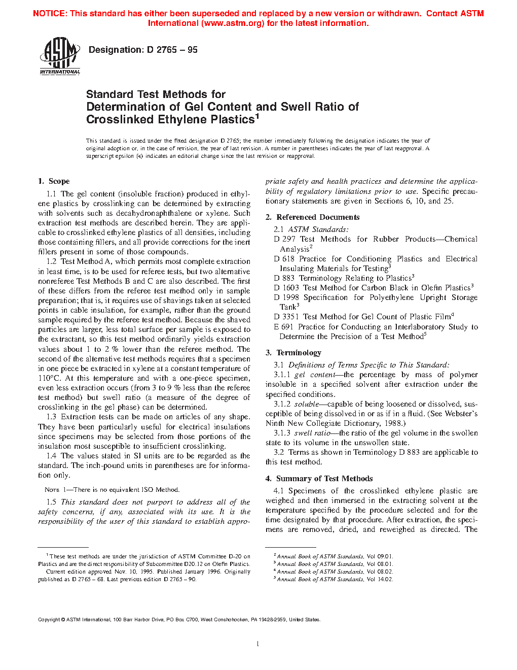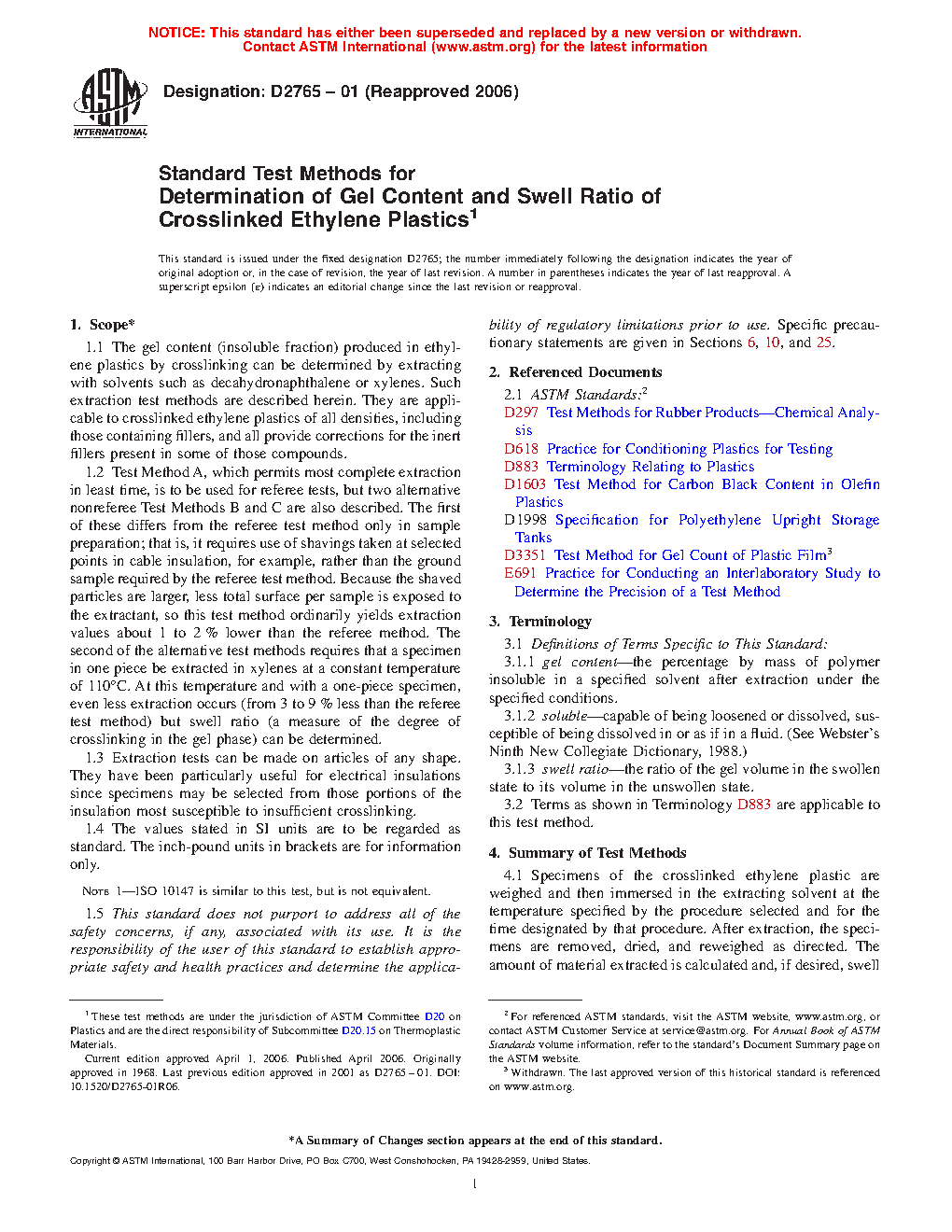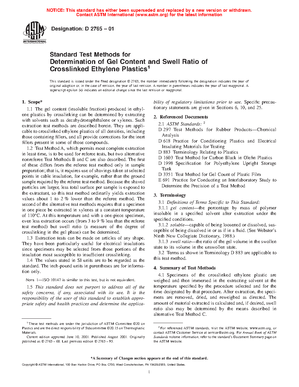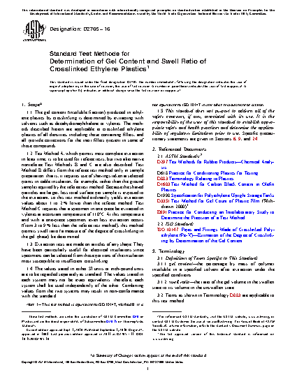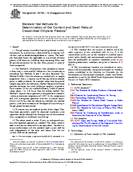 1.2 Test Method A, which permits most complete extraction in least time, is to be used for referee tests, but two alternative nonreferee Test Methods B and C are also described. Test Method B differs from the referee test method only in sample preparation; that is, it requires use of shavings taken at selected points in cable insulation, for example, rather than the ground sample required by the referee test method. Because the shaved particles are larger, less total surface per sample is exposed to the extractant, so this test method ordinarily yields extraction values about 1 to 2 % lower than the referee method. Test Method C requires that a specimen in one piece be extracted in xylenes at a constant temperature of 110°C. At this temperature and with a one-piece specimen, even less extraction occurs (from 3 to 9 % less than the referee test method), this method permits swell ratio (a measure of the degree of crosslinking in the gel phase) be determined.