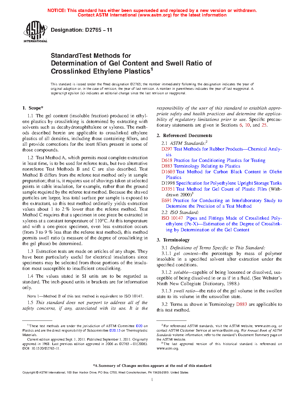 1.1 The gel content (insoluble fraction) produced in ethylene plastics by crosslinking is determined by extracting with solvents such as decahydronaphthalene or xylenes. The methods described herein are applicable to crosslinked ethylene plastics of all densities, including those containing fillers, and all provide corrections for the inert fillers present in some of those compounds.
