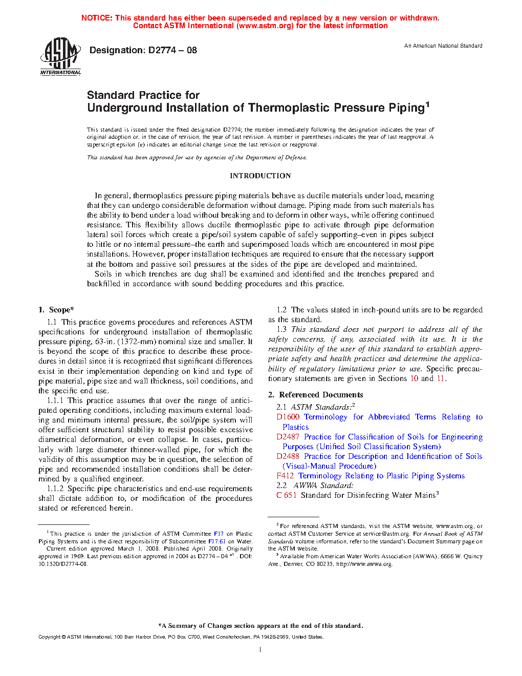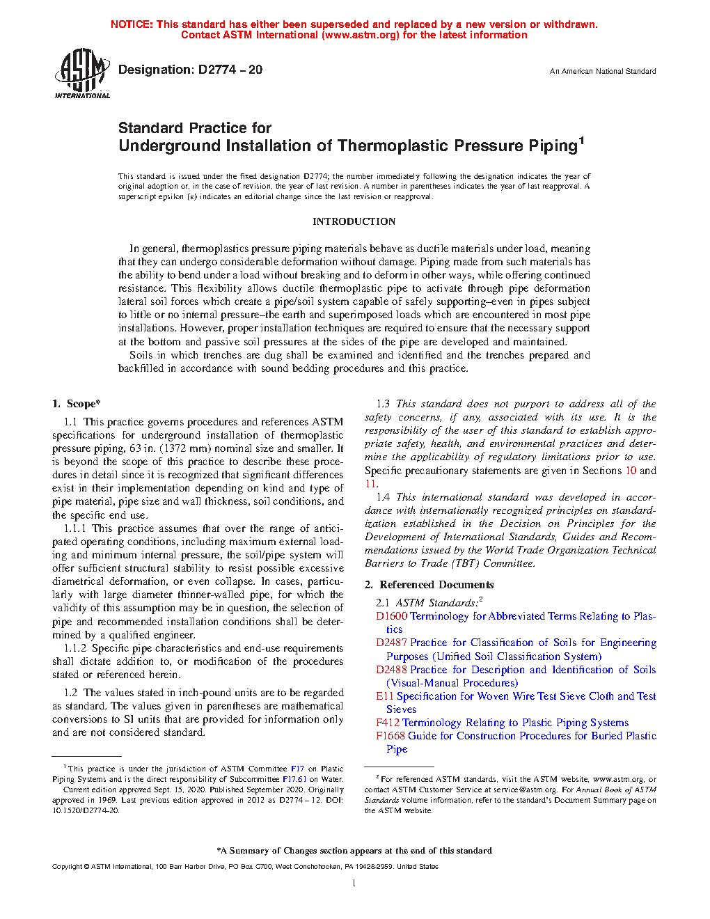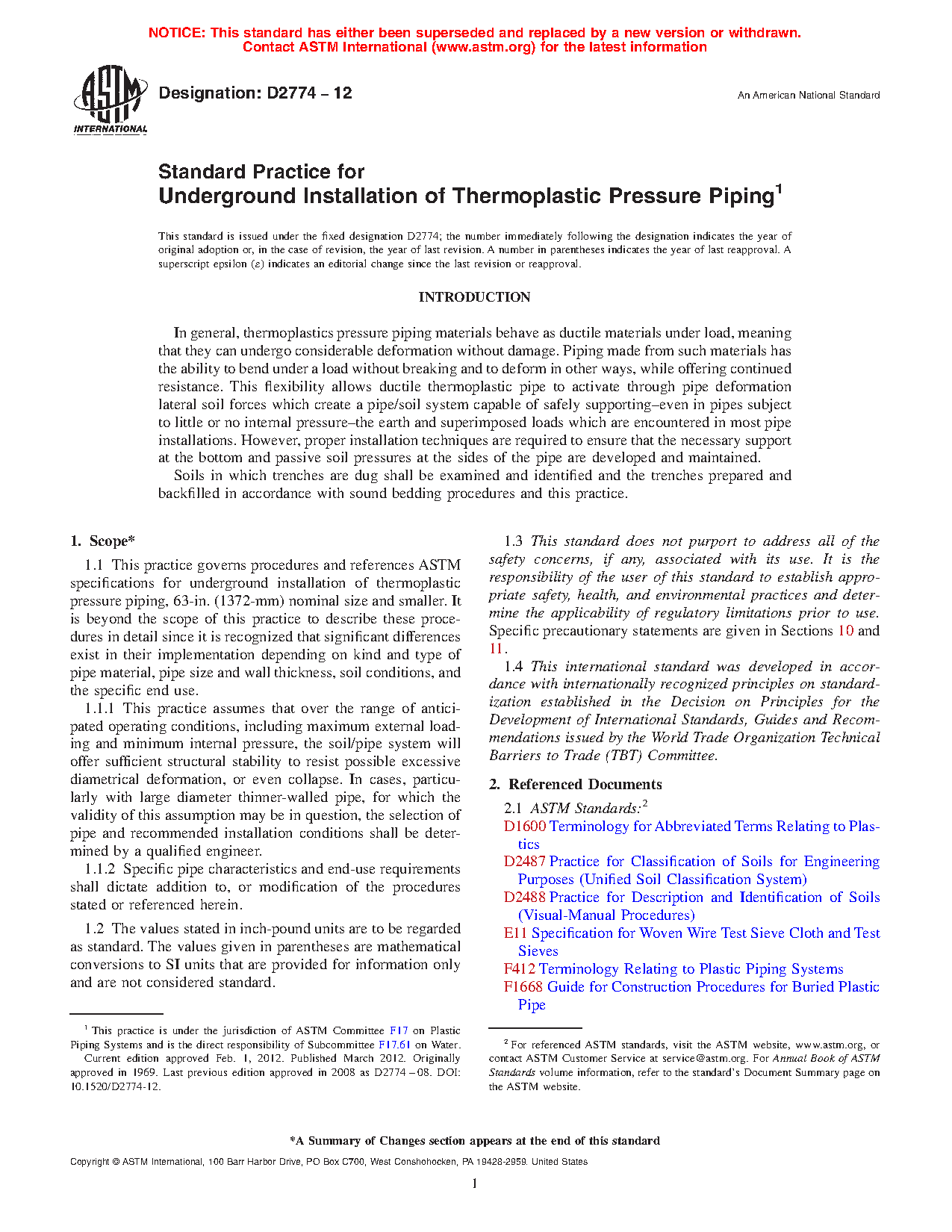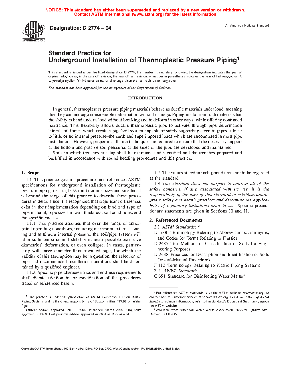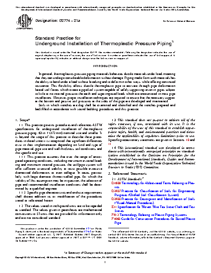 1.1 This practice governs procedures and references ASTM specifications for underground installation of thermoplastic pressure piping, 63 in. (1372 mm) nominal size and smaller. It is beyond the scope of this practice to describe these procedures in detail since it is recognized that significant differences exist in their implementation depending on kind and type of pipe material, pipe size and wall thickness, soil conditions, and the specific end use.