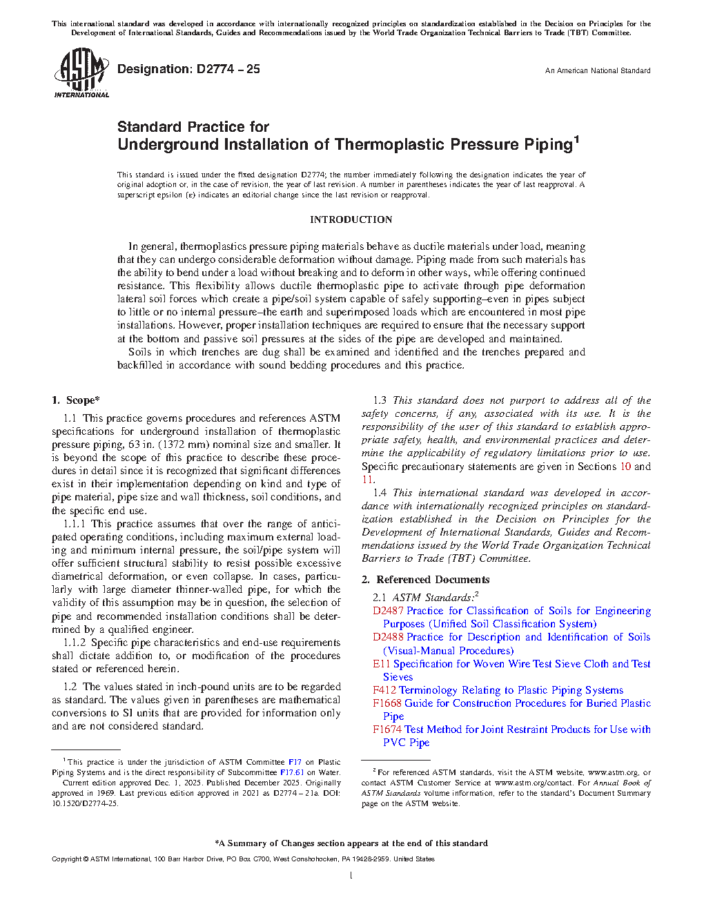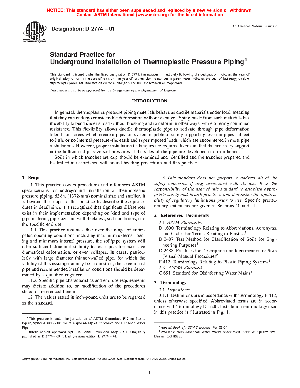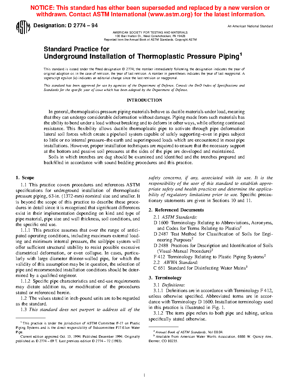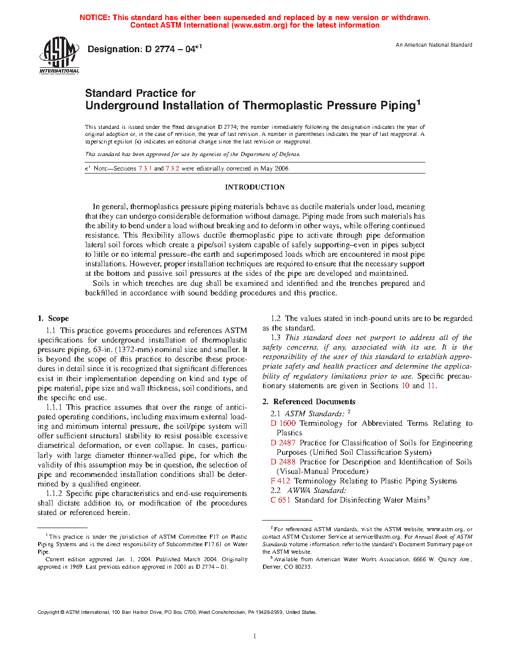 1.1 This practice governs procedures and references ASTM specifications for underground installation of thermoplastic pressure piping, 63 in. (1372 mm) nominal size and smaller. It is beyond the scope of this practice to describe these procedures in detail since it is recognized that significant differences exist in their implementation depending on kind and type of pipe material, pipe size and wall thickness, soil conditions, and the specific end use.