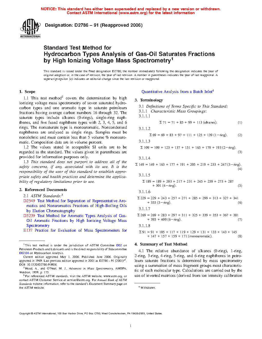 1.1 This test method covers the determination by high ionizing voltage mass spectrometry of seven saturated hydrocarbon types and one aromatic type in saturate petroleum fractions having average carbon numbers 16 through 32. The saturate types include alkanes (0-rings), single-ring naphthenes, and five fused naphthene types with 2, 3, 4, 5, and 6 rings. The nonsaturate type is monoaromatic. Noncondensed naphthenes are analyzed as single rings. Samples must be nonolefinic and must contain less than 5 volume % monoaromatic. Composition data are in volume percent.