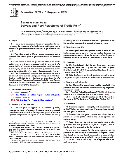 1.1 This practice describes a laboratory procedure for determining the resistance of a dried film of traffic paint to the action of a specified hydrocarbon solvent or gasoline fuel test fluid.
