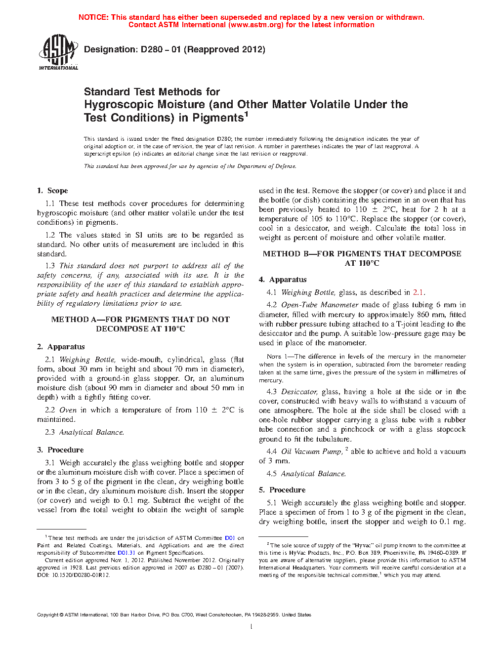 1.1 These test methods cover procedures for determining hygroscopic moisture (and other matter volatile under the test conditions) in pigments.