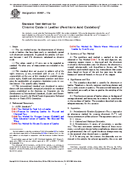 1.1 This test method covers the determination of chromic oxide in leathers that have been partly or completely tanned with chromium compounds. In general, the samples will contain between 1 % and 5 % chromium, calculated as chromic oxide.