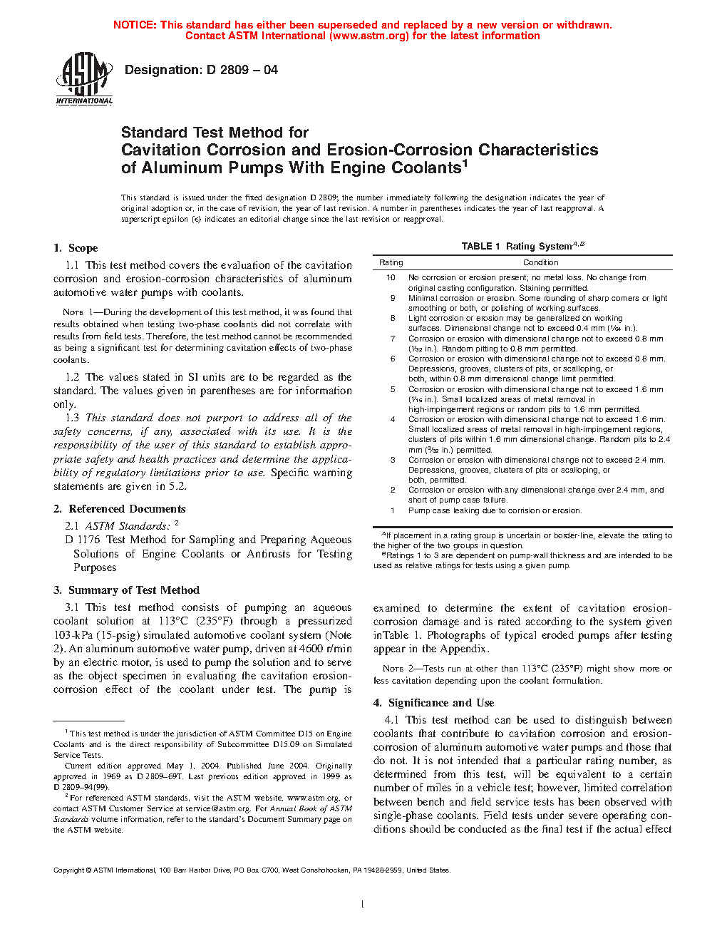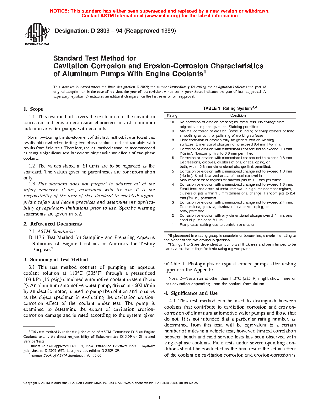 Note 1: During the development of this test method, it was found that results obtained when testing two-phase coolants did not correlate with results from field tests. Therefore, the test method cannot be recommended as being a significant test for determining cavitation effects of two-phase coolants.