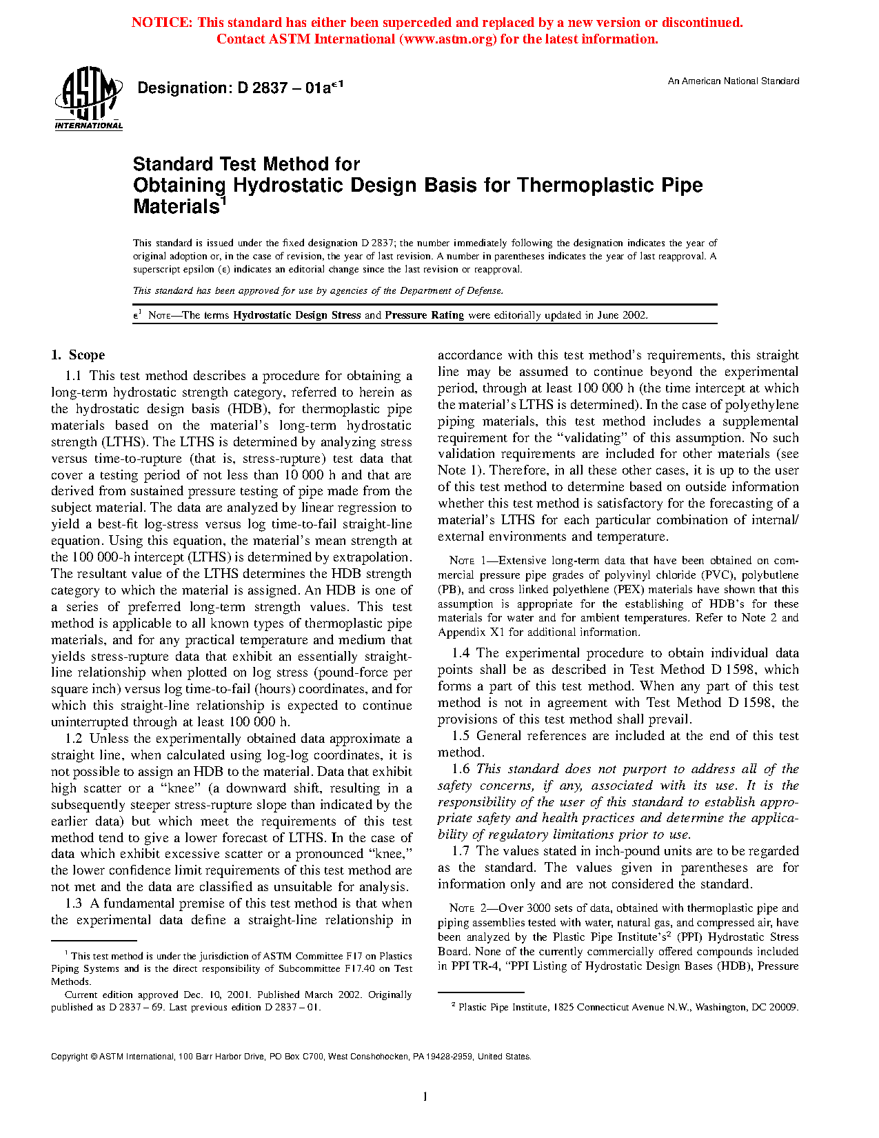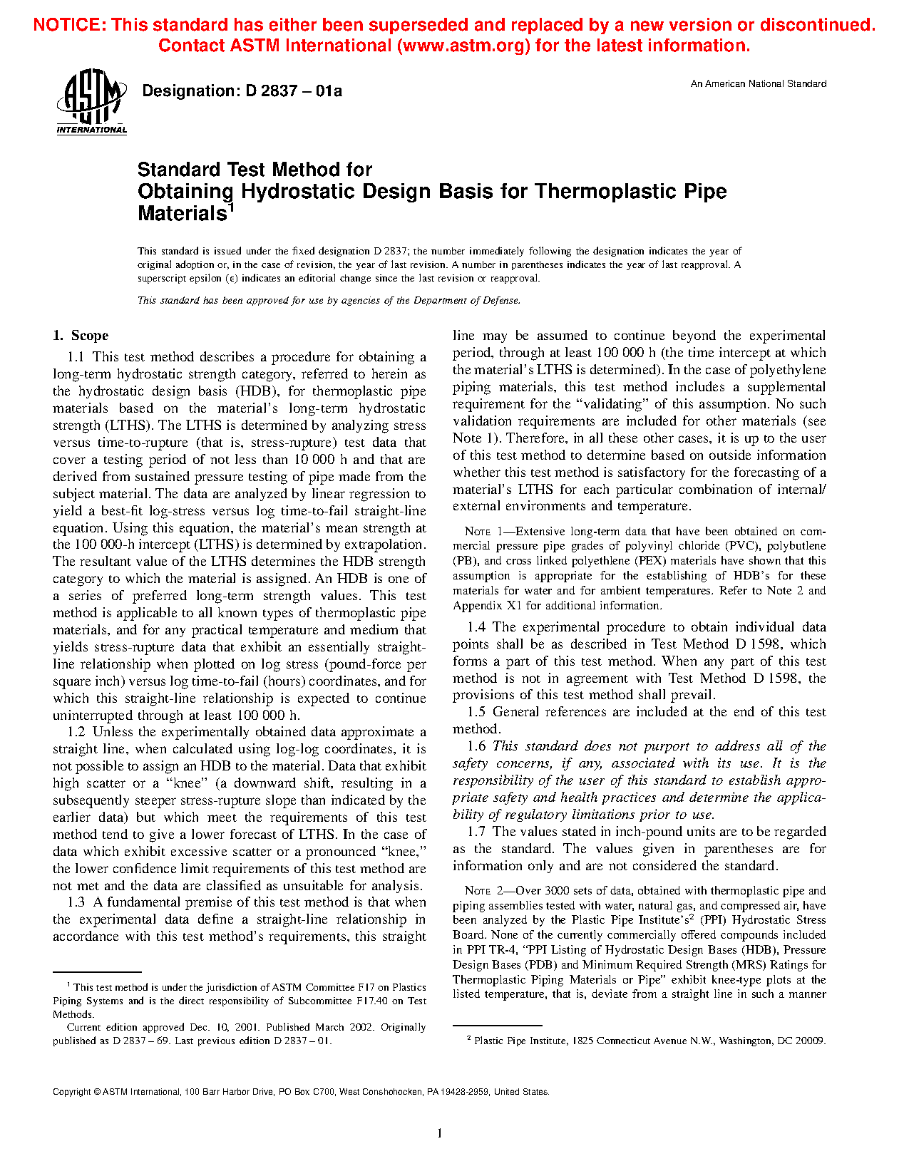 Note 1: Extensive long-term data that have been obtained on commercial pressure pipe grades of polyvinyl chloride (PVC), polybutylene (PB), and cross linked polyethylene (PEX) materials have shown that this assumption is appropriate for the establishing of HDB's for these materials for water and for ambient temperatures. Refer to Note 2 and Appendix X1 for additional information.