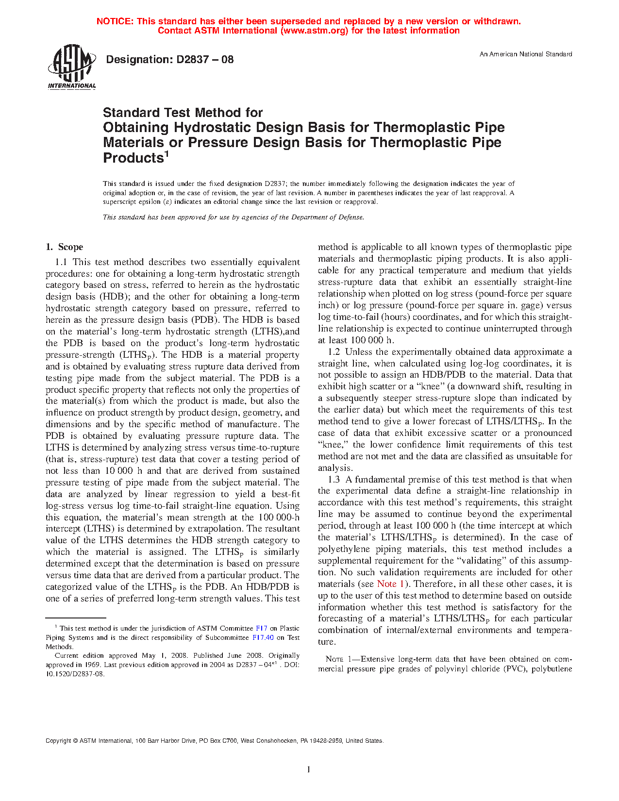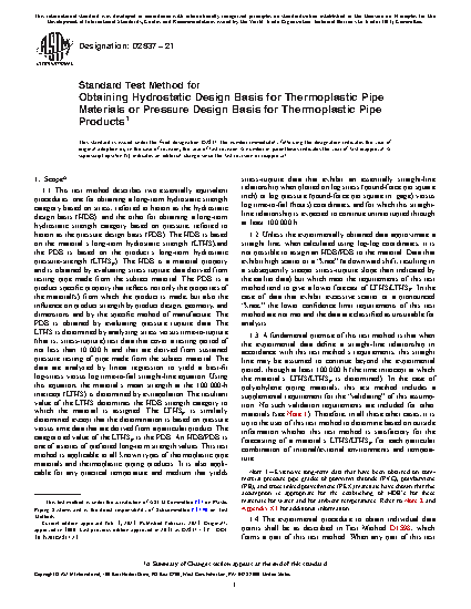 1.1 This test method describes two essentially equivalent procedures: one for obtaining a long-term hydrostatic strength category based on stress, referred to herein as the hydrostatic design basis (HDB); and the other for obtaining a long-term hydrostatic strength category based on pressure, referred to herein as the pressure design basis (PDB). The HDB is based on the material's long-term hydrostatic strength (LTHS),and the PDB is based on the product's long-term hydrostatic pressure-strength (LTHSP). The HDB is a material property and is obtained by evaluating stress rupture data derived from testing pipe made from the subject material. The PDB is a product specific property that reflects not only the properties of the material(s) from which the product is made, but also the influence on product strength by product design, geometry, and dimensions and by the specific method of manufacture. The PDB is obtained by evaluating pressure rupture data. The LTHS is determined by analyzing stress versus time-to-rupture (that is, stress-rupture) test data that cover a testing period of not less than 10 000 h and that are derived from sustained pressure testing of pipe made from the subject material. The data are analyzed by linear regression to yield a best-fit log-stress versus log time-to-fail straight-line equation. Using this equation, the material's mean strength at the 100 000-h intercept (LTHS) is determined by extrapolation. The resultant value of the LTHS determines the HDB strength category to which the material is assigned. The LTHSP is similarly determined except that the determination is based on pressure versus time data that are derived from a particular product. The categorized value of the LTHSP is the PDB. An HDB/PDB is one of a series of preferred long-term strength values. This test method is applicable to all known types of thermoplastic pipe materials and thermoplastic piping products. It is also applicable for any practical temperature and medium that yields stress-rupture data that exhibit an essentially straight-line relationship when plotted on log stress (pound-force per square inch) or log pressure (pound-force per square in. gage) versus log time-to-fail (hours) coordinates, and for which this straight-line relationship is expected to continue uninterrupted through at least 100 000 h.