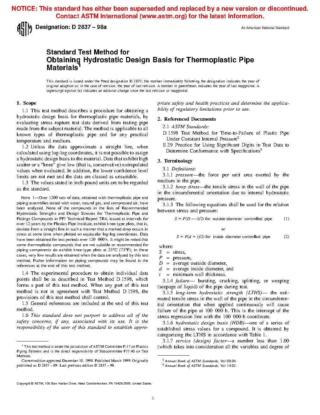 1.4 The experimental procedure to obtain individual data points shall be as described in Test Method D1598, which forms a part of this test method. When any part of this test method is not in agreement with Test Method D1598, the provisions of this test method shall prevail.