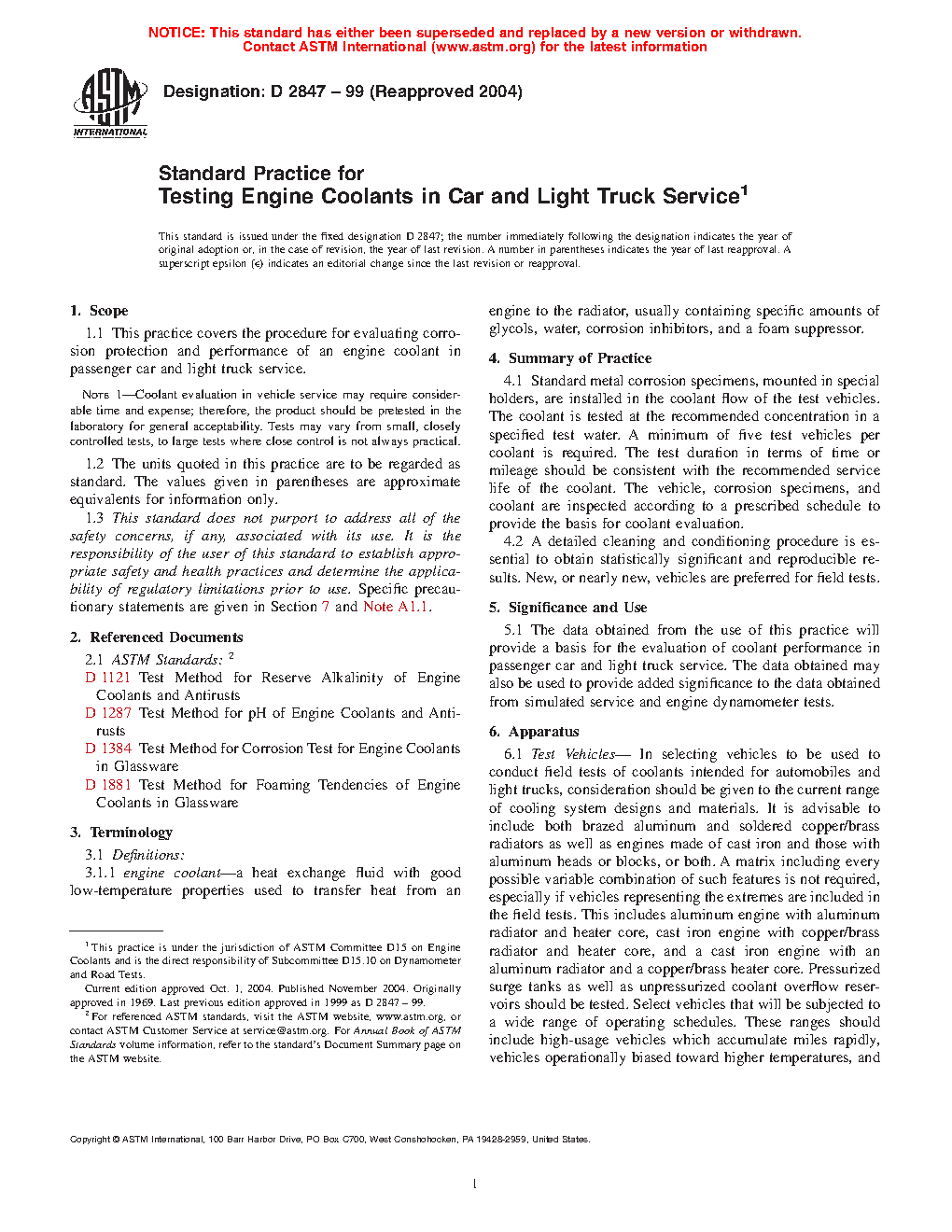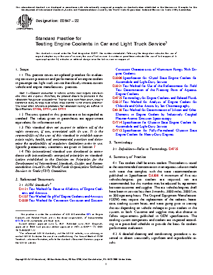 1.1 This practice covers the procedure for evaluating corrosion protection and performance of an engine coolant in passenger car and light truck service. Note 1Coolant evaluation in vehicle service may require considerable time and expense; therefore, the product should be pretested in the laboratory for general acceptability. Tests may vary from small, closely controlled tests, to large tests where close control is not always practical.