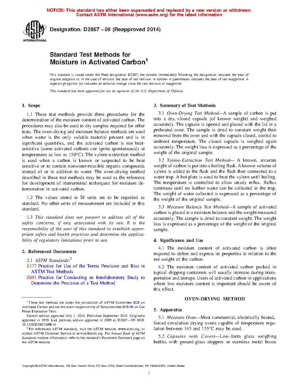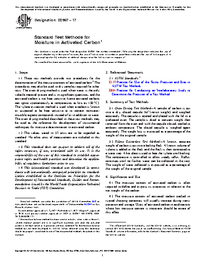 1.1 These test methods provide three procedures for the determination of the moisture content of activated carbon. The procedures may also be used to dry samples required for other tests. The oven drying and moisture balance methods are used when water is the only volatile material present and is in significant quantities, and the activated carbon is not heat sensitive (some activated carbons can ignite spontaneously at temperatures as low as 150 °C). The xylene extraction method is used when a carbon is known or suspected to be heat sensitive or to contain miscible organic compounds instead of or in addition to water. The interferences posed by miscible inorganic compounds has not been determined. The oven drying method described in these test methods may be used as the reference for development of instrumental techniques for moisture determination in activated carbon.