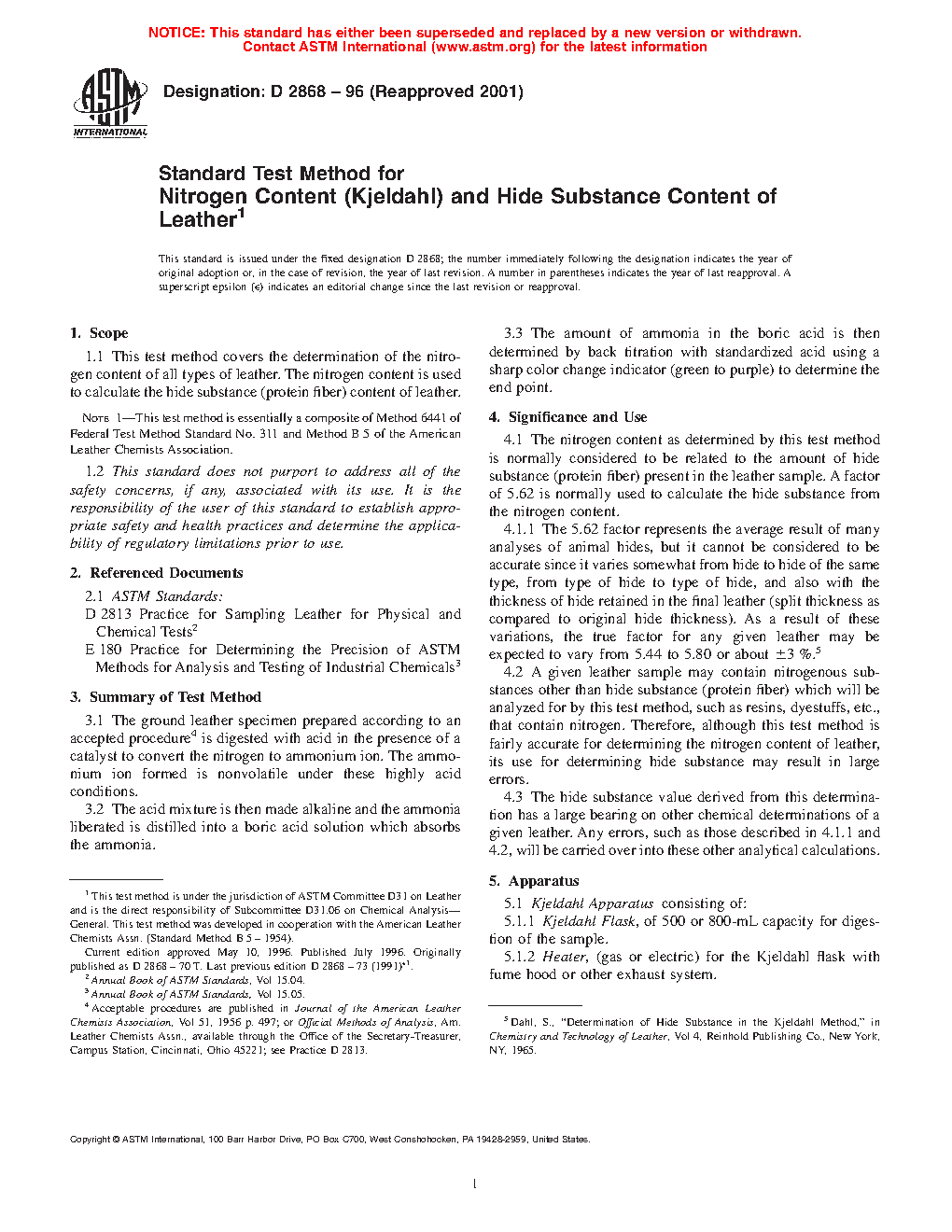 4.1.1 The 5.62 factor represents the average result of many analyses of animal hides, but it cannot be considered to be accurate since it varies somewhat from hide to hide of the same type, from type of hide to type of hide, and also with the thickness of hide retained in the final leather (split thickness as compared to original hide thickness). As a result of these variations, the true factor for any given leather may be expected to vary from 5.44 to 5.80 or about ±3 %.3