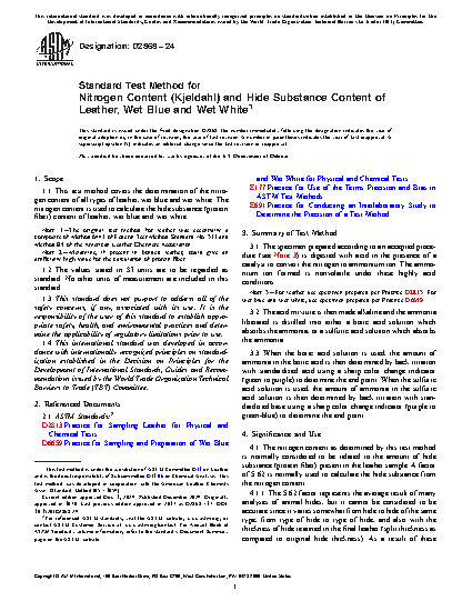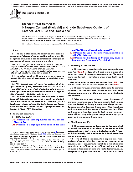 1.1 This test method covers the determination of the nitrogen content of all types of leather, wet blue and wet white. The nitrogen content is used to calculate the hide substance (protein fiber) content of leather, wet blue and wet white.