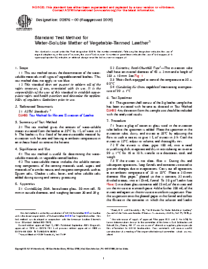 1.1 This test method covers the determination of the water-soluble materials in all types of vegetable-tanned leathers. Thiks test method does not apply to wet blue.