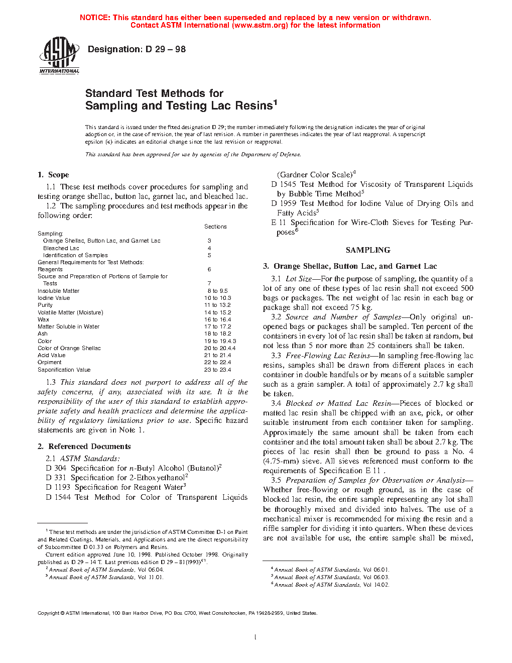 Sections Sampling: Orange Shellac, Button Lac, and Garnet Lac 3 Bleached Lac 4 Identification of Samples 5 General Requirements for Test Methods: Reagents 6 Source and Preparation of Portions of Sample for Tests 7 Insoluble Matter 8 to 9.5 Iodine Value 10 to 10.3 Purity 11 to 13.2 Volatile Matter (Moisture) 14 to 15.2 Wax 16 to 16.4 Matter Soluble in Water 17 to 17.2 Ash 18 to 18.2 Color 19 to 19.4.3 Color of Orange Shellac 20 to 20.4.4 Acid Value 21 to 21.4 Orpiment 22 to 22.4 Saponification Value 23 to 23.41.3 This standard does not purport to address all of the safety problems, if any, associated with its use. It is the responsibility of the user of this standard to establish appropriate safety and health practices and determine the applicability of regulatory limitations prior to use.> Specific hazard statements are given in Note 1.